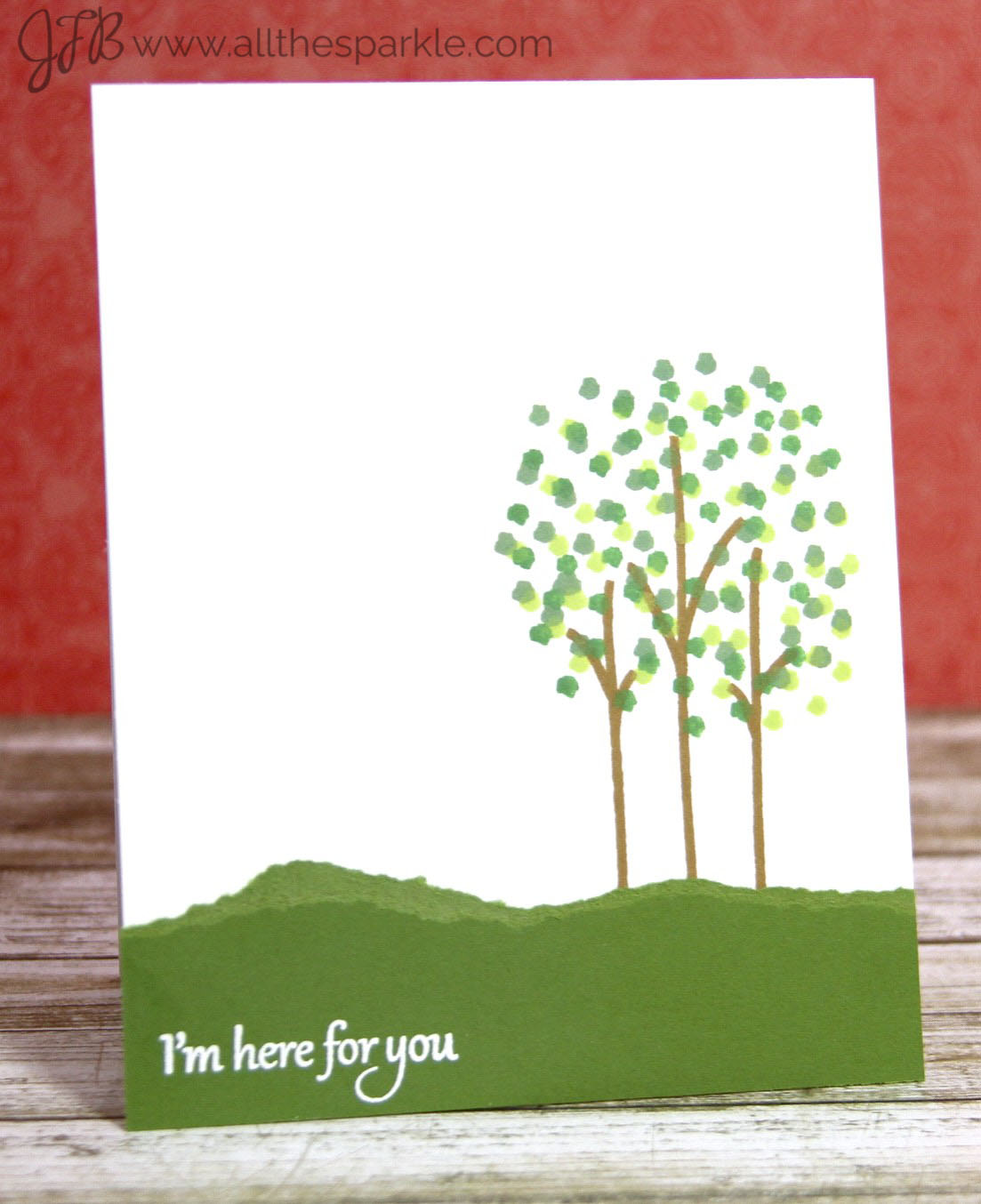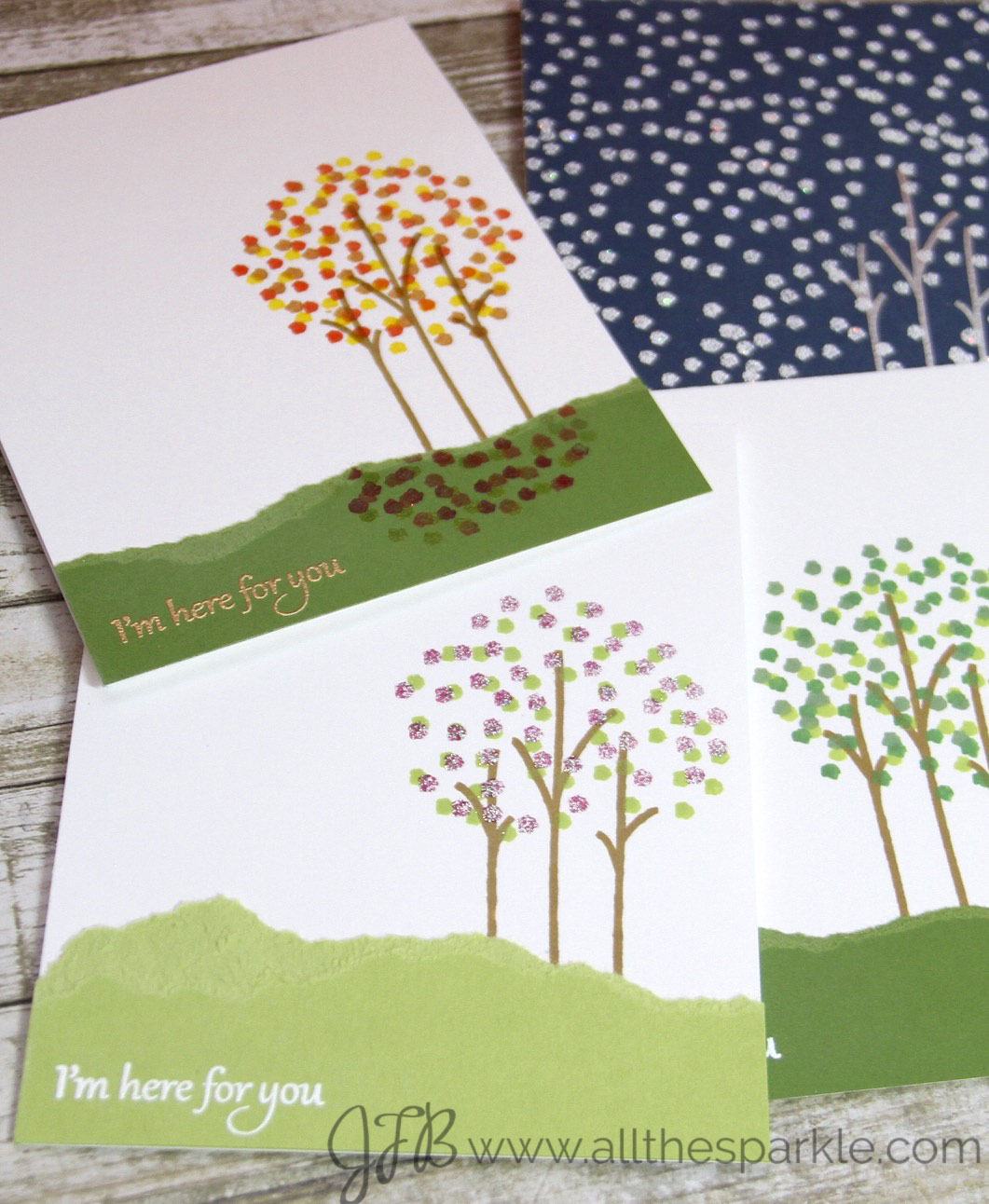James Taylor is one of my mom’s favorite singers and I grew up singing MANY of his songs. “You’ve Got a Friend” has always been a particular favorite of mine. So when Michele contacted me and I was looking around the shop I kept coming back to Calm and Gentle. I loved the simple design of the tree trunk and branches and I could see lots of possibilities for the leaves. When the set arrived and I started playing around with it I came up with the idea of doing 4 cards to represent each season. As I chose the sentiment I kept humming “Winter, spring, summer, or fall, all you have to do is call and I’ll be there”…and there’s the theme for this set of cards!