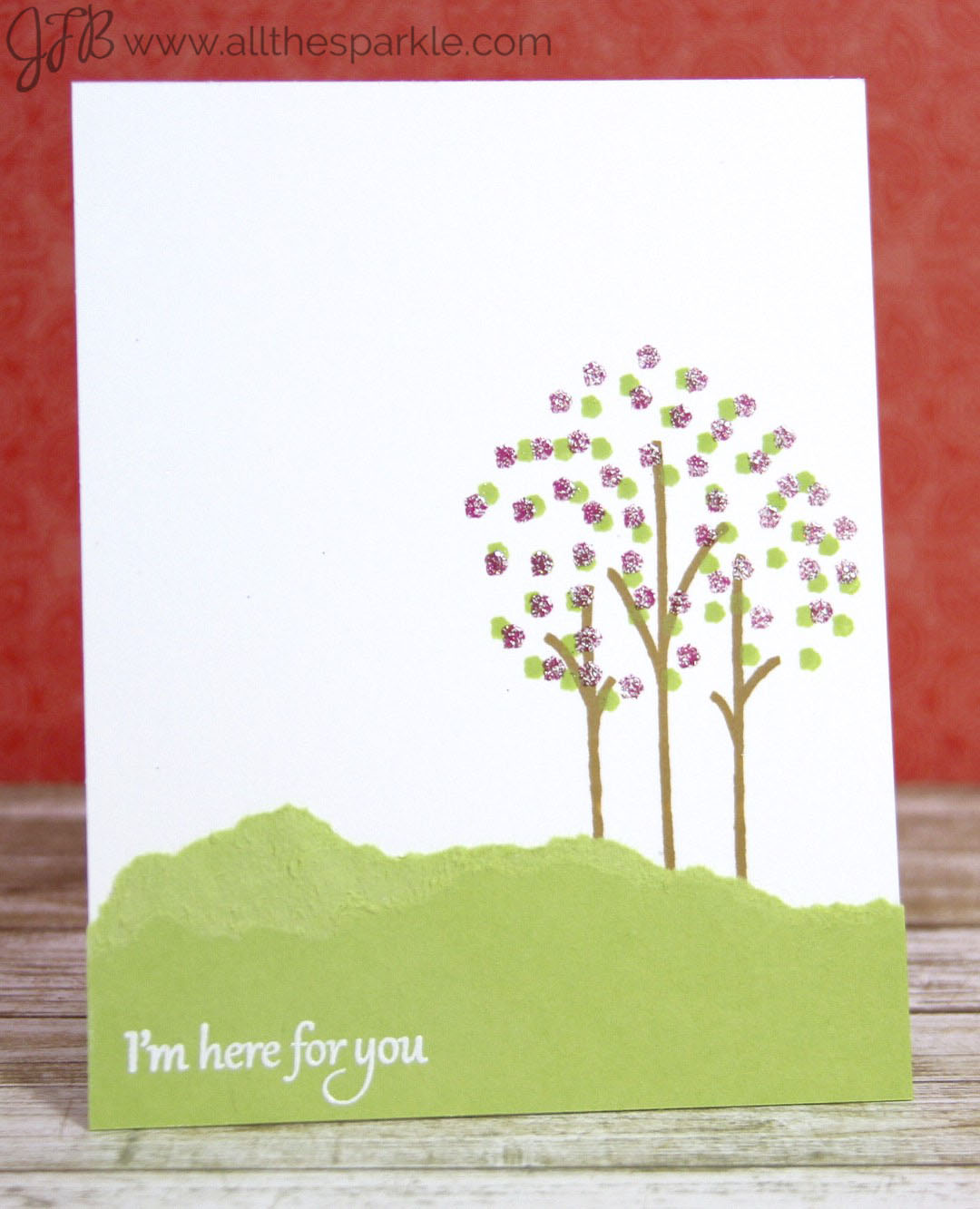To create the spring card I tore a piece of green cardstock to create the landscape and adhered it to my card front. I stamped the sentiment from Calm and Gentle with versamark and heat-embossed it with white powder. I stamped the leaves with a pale green dye ink and then rotated and offset the stamp slightly before stamping it again with versamark. To create the flowers I heat-embossed it with a glittery pink embossing powder.