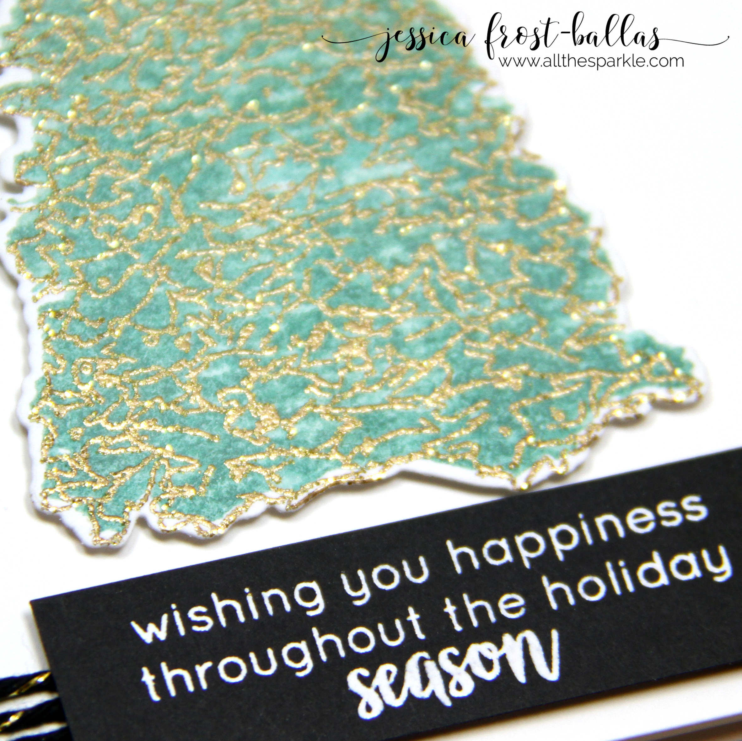 I’ve realized very quickly that this series is going to be a seriously enabling endeavor…that Neat and Tangled set immediately went on my wishlist! It was so much fun to color! I started by coloring all of the elements with copic markers. Then I blended a little evergreen bough distress ink onto a piece of watercolor paper. I trimmed some of the patterned paper down to smaller squares and then layered them onto a card base ending with the watercolor paper on top. Next I laid out the shelves and then started adding my images. I adhered some with foam mounting tape and some with regular ATG adhesive for a little extra dimension. I also added a little clear spectrum noir sparkle to the ribbons and the snow globe and then added glossy accents to the snow globe.