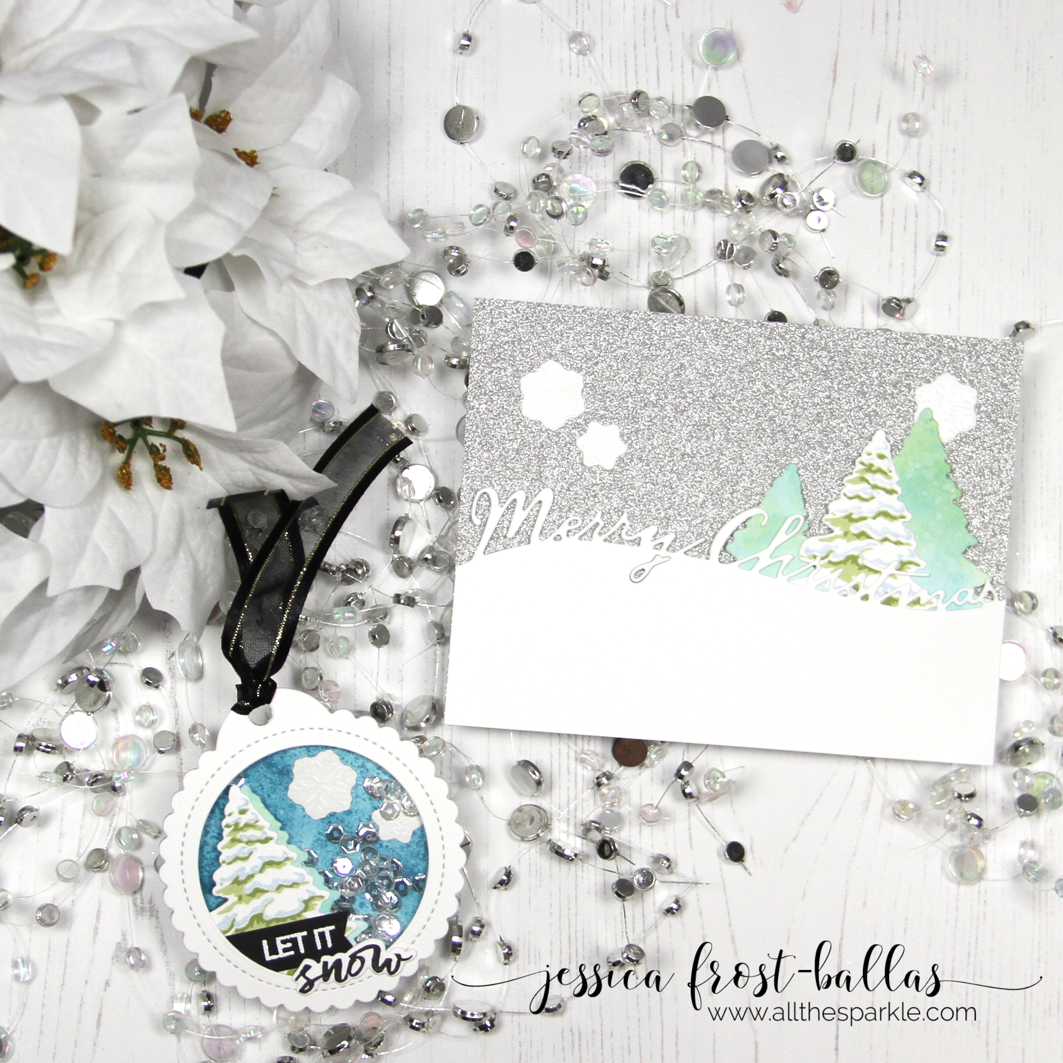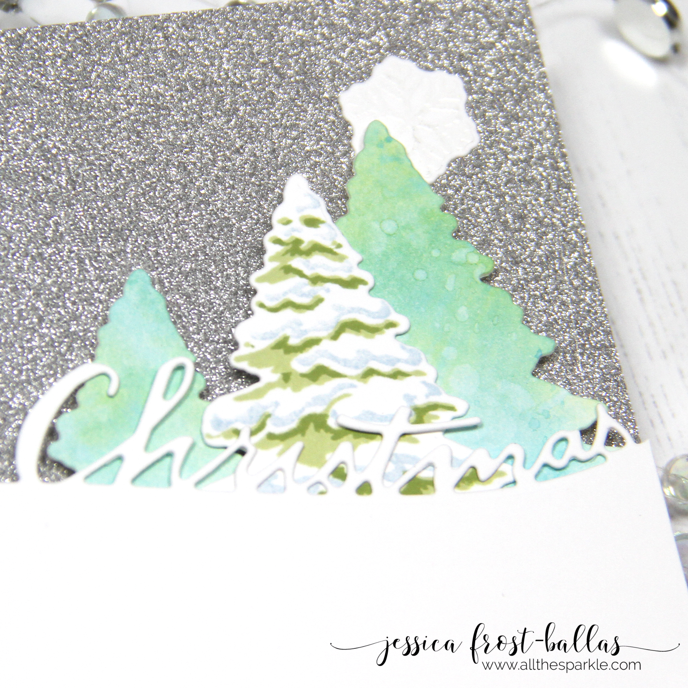 Jessica doing this with you was so much fun, thank you for having me be a part of it! Your card and tag–perfection! I really like how you used both styles of trees on the sparkly sky. Thank you for making a tag with your products, makes my heart happy!
