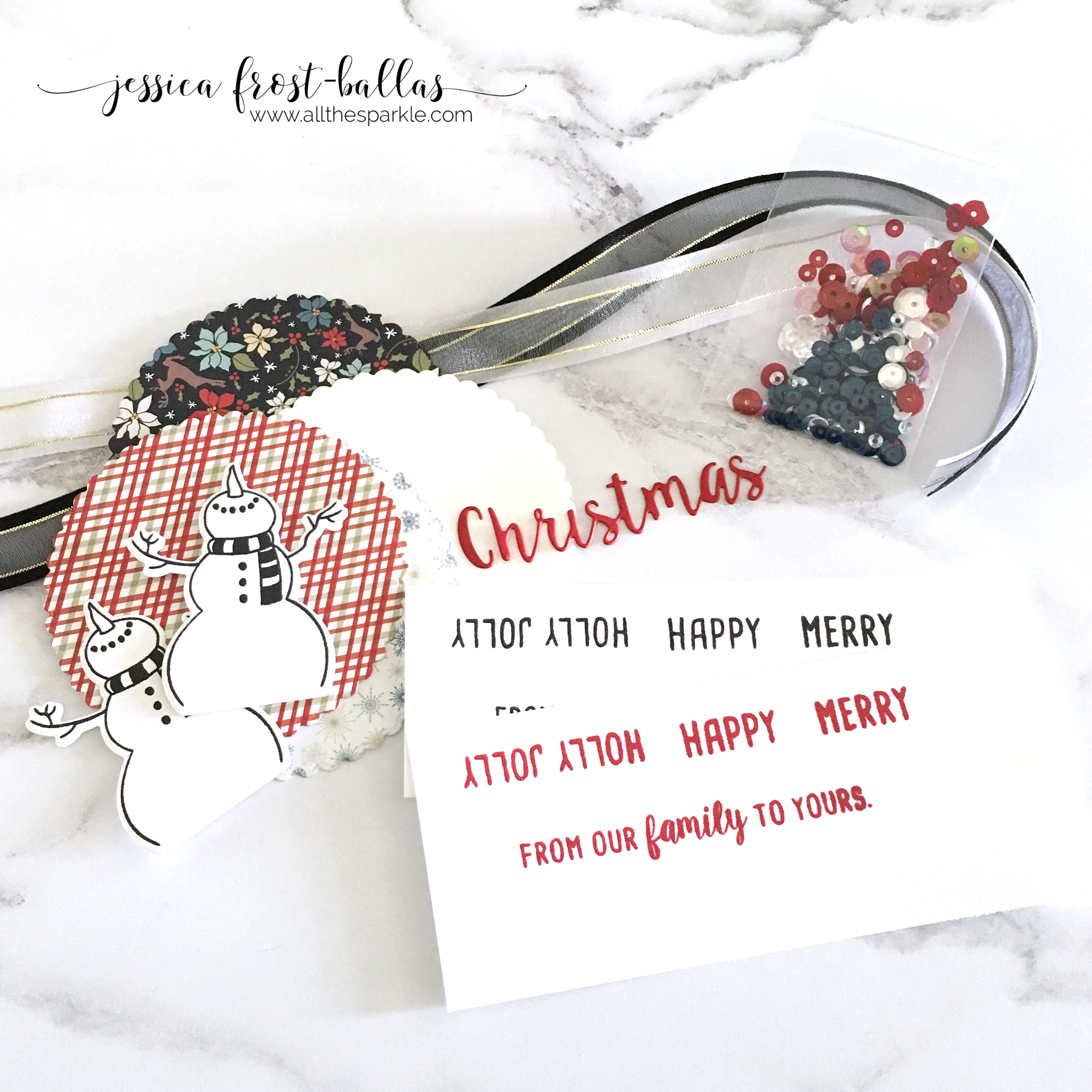 Again I knew I wanted to make a tag so I tried to send lots of little things that could be used in different ways. I decided to layer vellum over my patterned paper to tone it down a bit. Then I colored my snowman with copics, added spectrum noir clear sparkle to his scarf, and pressed a versamark pad over the entire snowman. I heat-embossed him with clear embossing powder twice to get a nice glossy image and then adhered him to the vellum. I added my die-cut sentiment and then finished the tag with a little ribbon and a sprinkling of sequins!