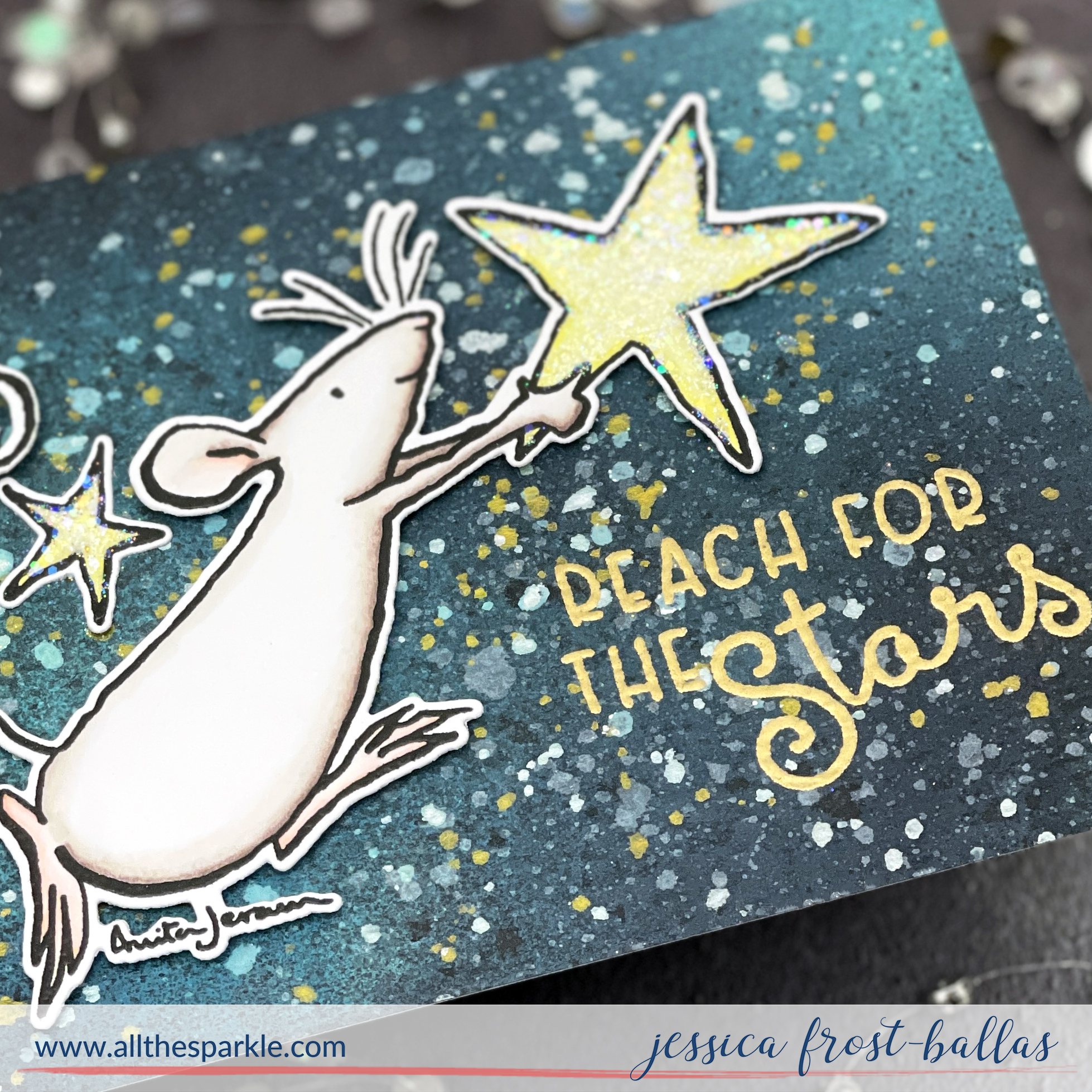 First I stamped the adorable mouse and sentiment from A Star is Born with versafine and heat-embossed them with clear embossing powder. I also stamped a mask, fussy cut it, and placed it over the mouse. Then I blended spun sugar, kitsch flamingo, shaded lilac, blueprint sketch, and prize ribbon distress oxide ink over the background. I also added a little hickory smoke at the bottom to ground my scene. I splattered the panel with water, shimmer spray, and white gouache and let it dry completely.