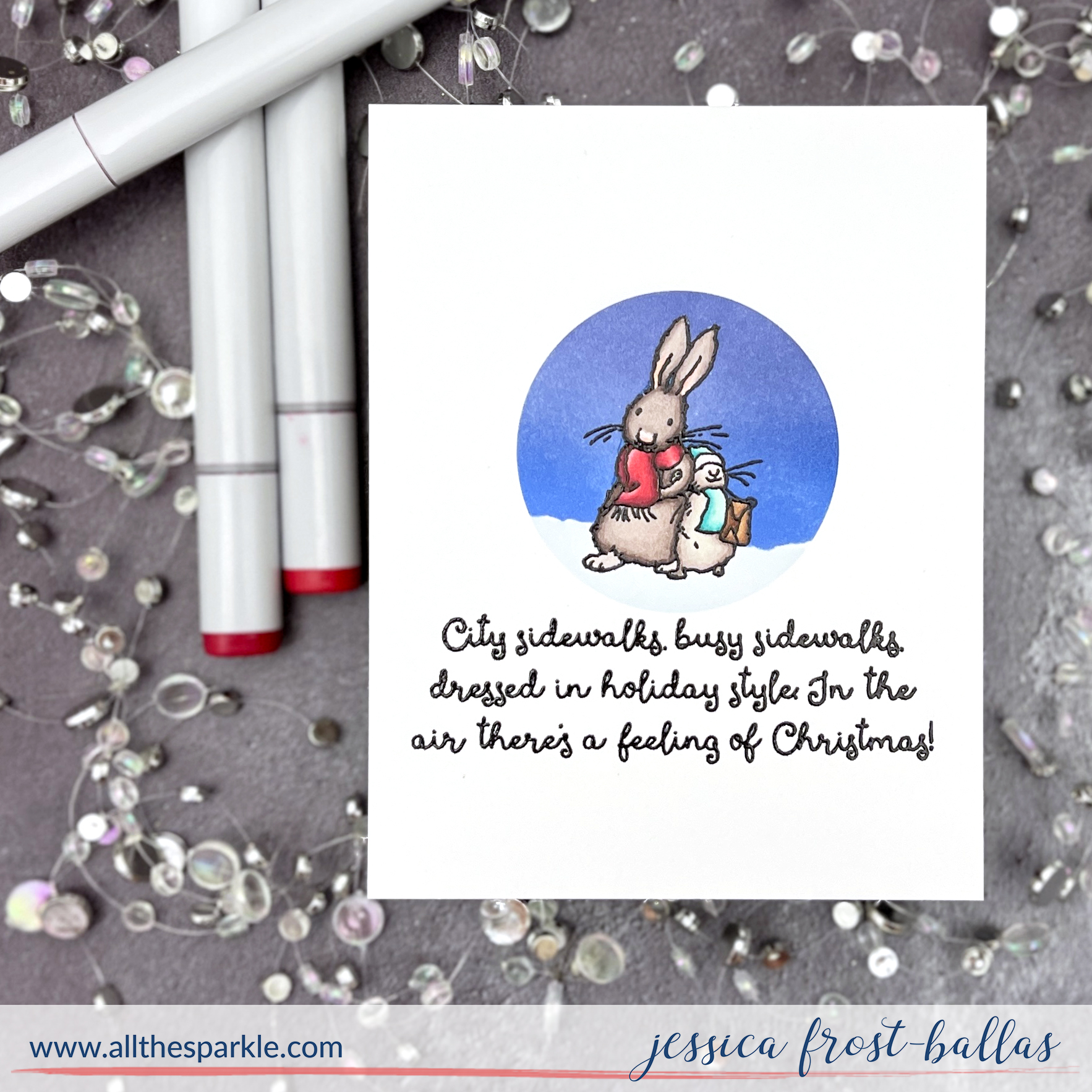 My second card is another copic colored and masked CAS design. I used a circle stencil to blend spun sugar, prize ribbon, and chipped sapphire distress oxide ink to create a snowy scene and then colored my image with copic markers. I love those adorable bunnies!