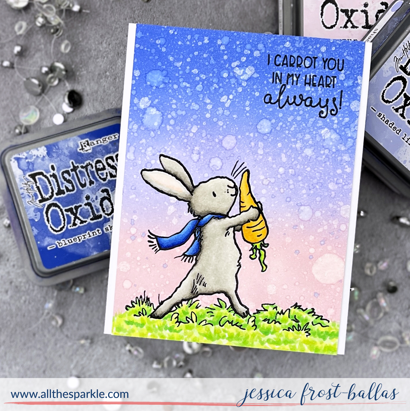 To start I stamped and masked the adorable bunny from Carrot On and grass from Greener Grass. Before coloring the critters I blended my sky with spun sugar, shaded lilac, and blueprint sketch distress oxide inks. I added some splatters of water and iridescent shimmer spray and then let the panel dry.