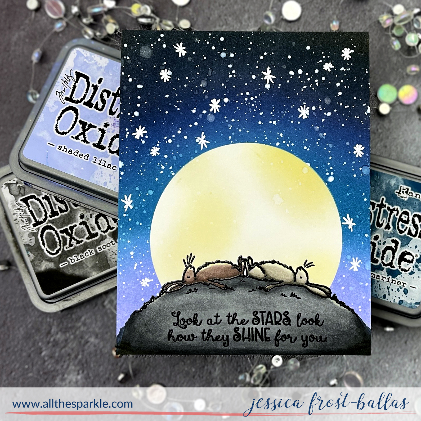To start, I stamped the bunnies and sentiment onto a panel of strathmore bristol smooth cardstock with versafine and heat-embossed it with clear embossing powder. Then I masked off the image and also created a mask for my moon from a circle die. Then I blended shaded lilac, uncharted mariner (LOVE this new color!), chipped sapphire, and black soot distress oxide ink onto my panel to create a night sky. I left the masks in place and then splattered the panel with water and metallic white paint and let it dry.