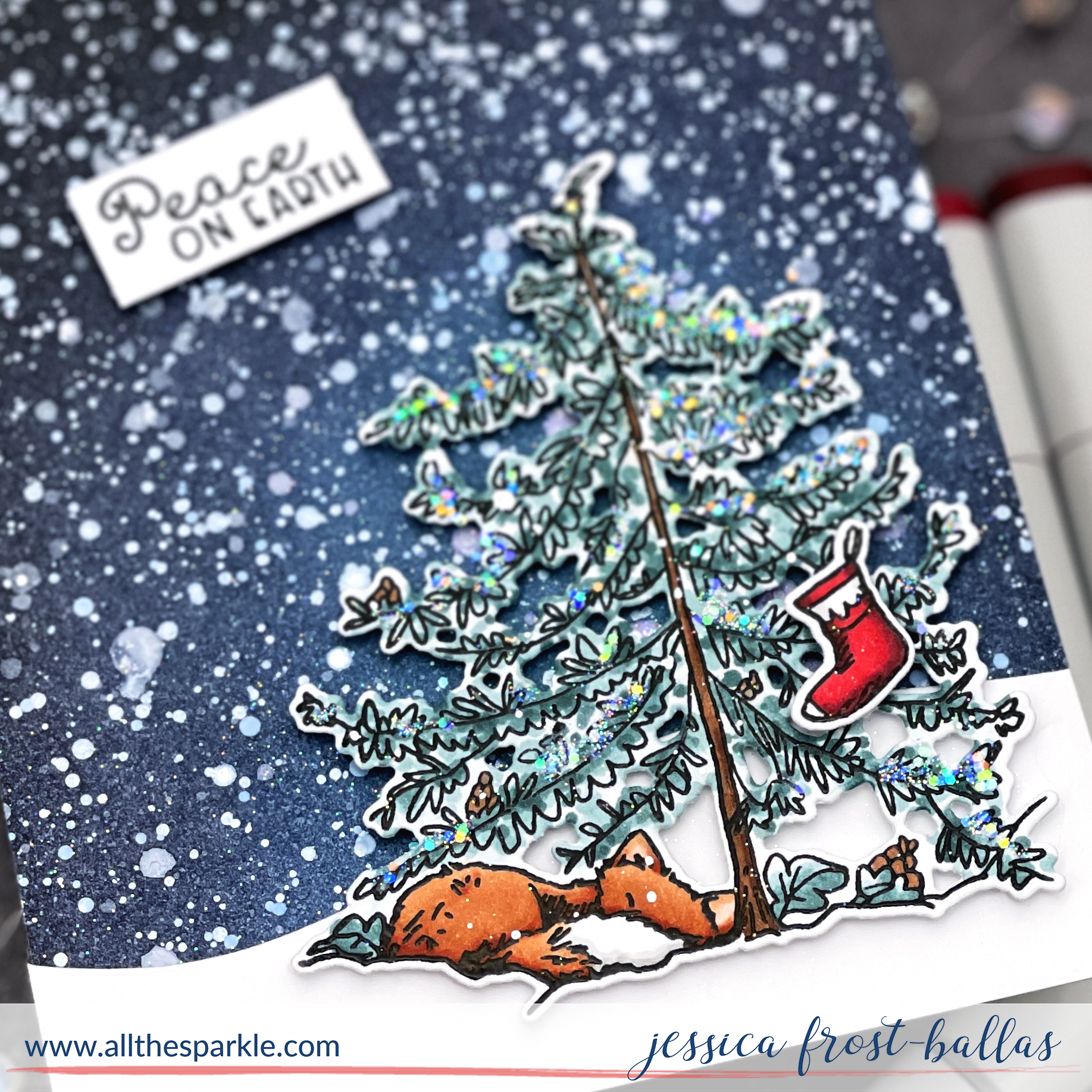 Then I stamped the adorable Peaceful Fox and colored him with topic markers. I ended up going outside the lines of the tree to give the branches a fuller greenery look and then die-cut everything with the coordinating dies. I love how the die cuts all around the tree branches so that the background peeks through. To finish the card I adhered him to a snowy hill and then added crystal glaze with chunky and prisma glitter!