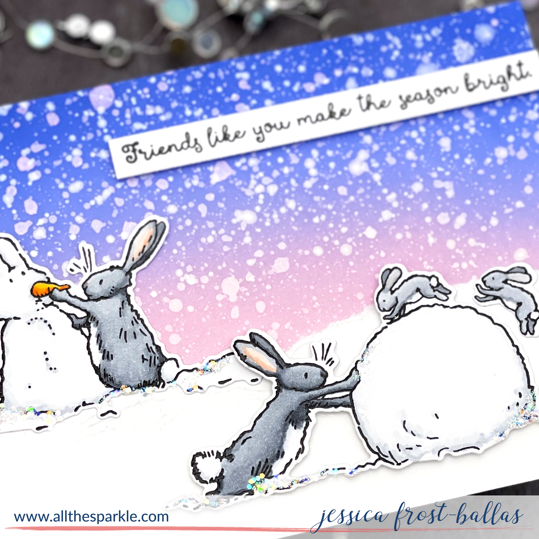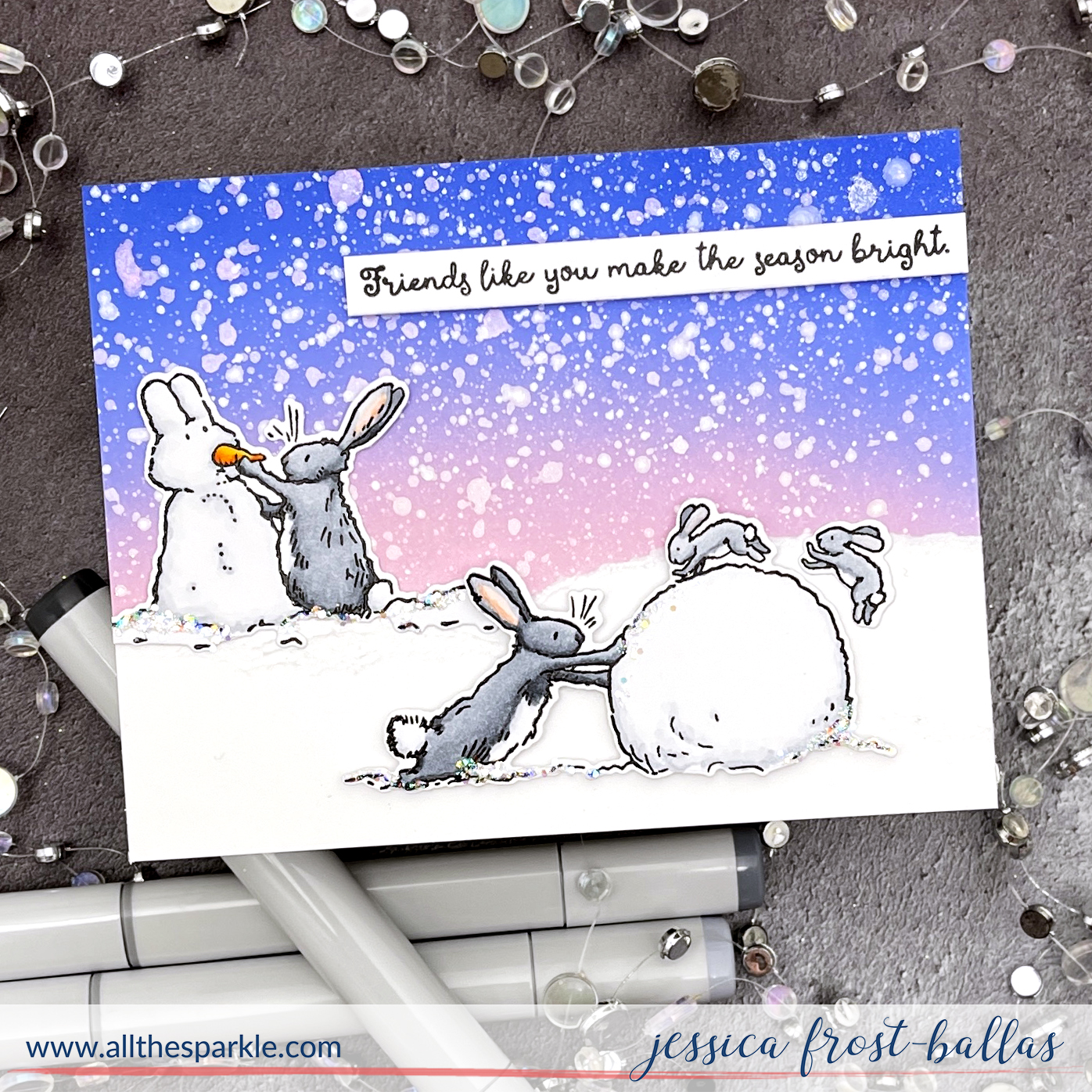 My first card uses the sweet Just Add Snow set featuring those cute bunnies! I created my background by blending Spun Sugar, Shaded Lilac, and Blueprint Sketch distress oxide ink onto an A2 panel. Then I added splatters of iridescent shimmer spray, white gouache, and water to create a snowy sky.