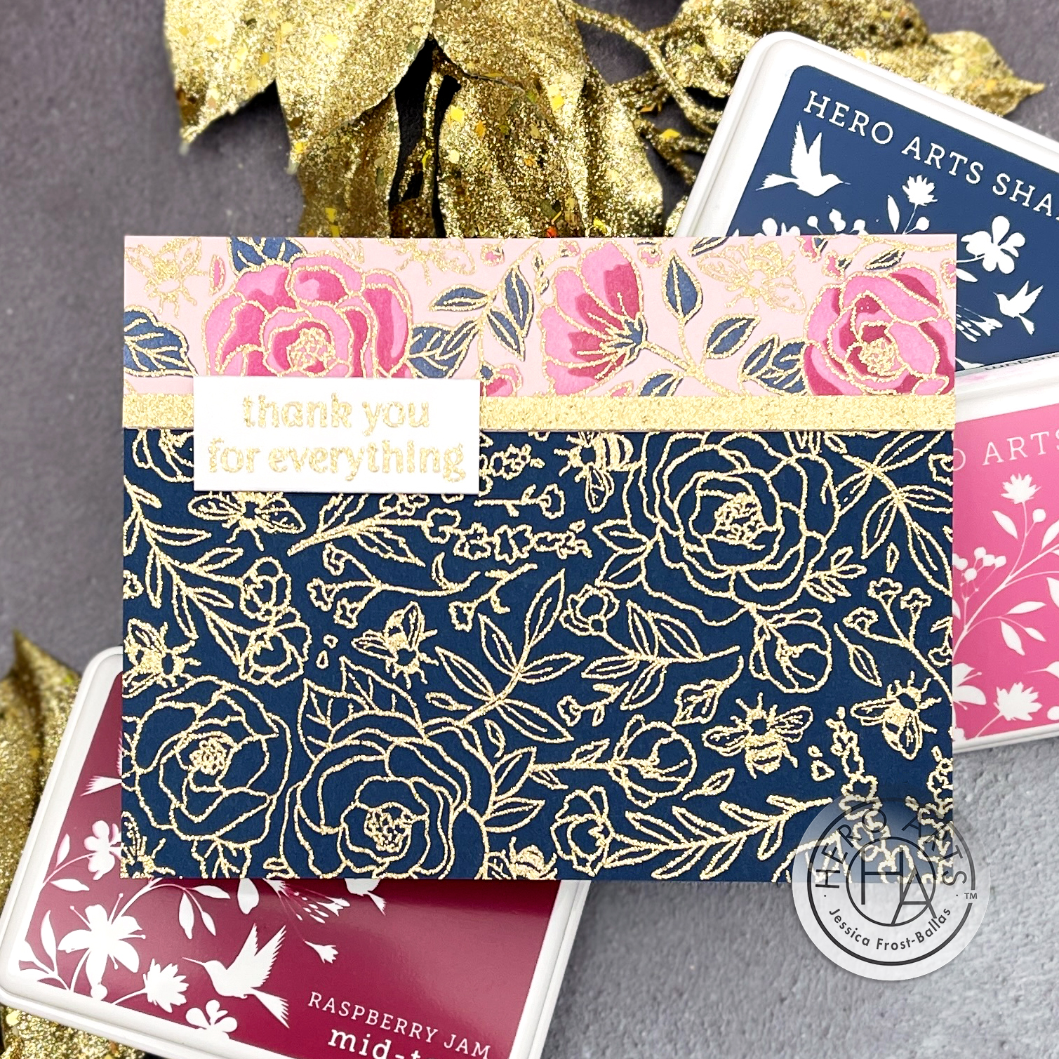 This is so gorgeous! I love the gold flowers outlined on the blue background! The colorful flowers at the top of the card really pop. 🙂