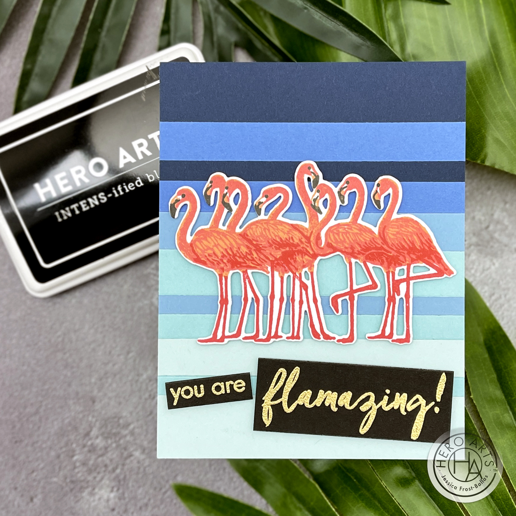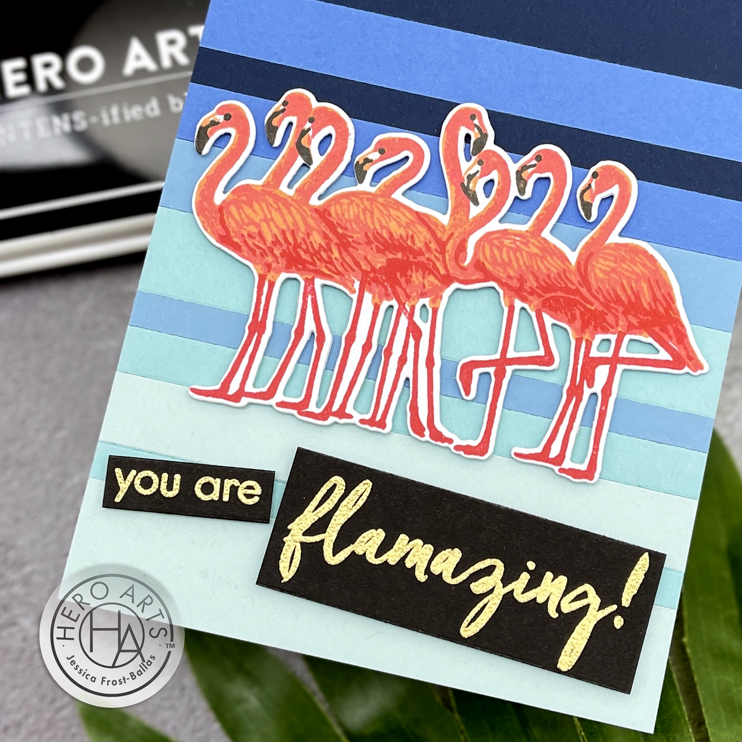 I stamped those gorgeous layering flamingos in shades of pink and then die-cut them with the coordinating dies. Next I took a bunch of blue and aqua cardstock scraps that I’ve been storing up and adhered them to a card base with my darkest colors towards the top and my lighter colors towards the bottom. I added a sentiment from the kit heat-embossed onto black cardstock with gold embossing powder and then adhered my flamingos with foam mounting tape to finish the card!