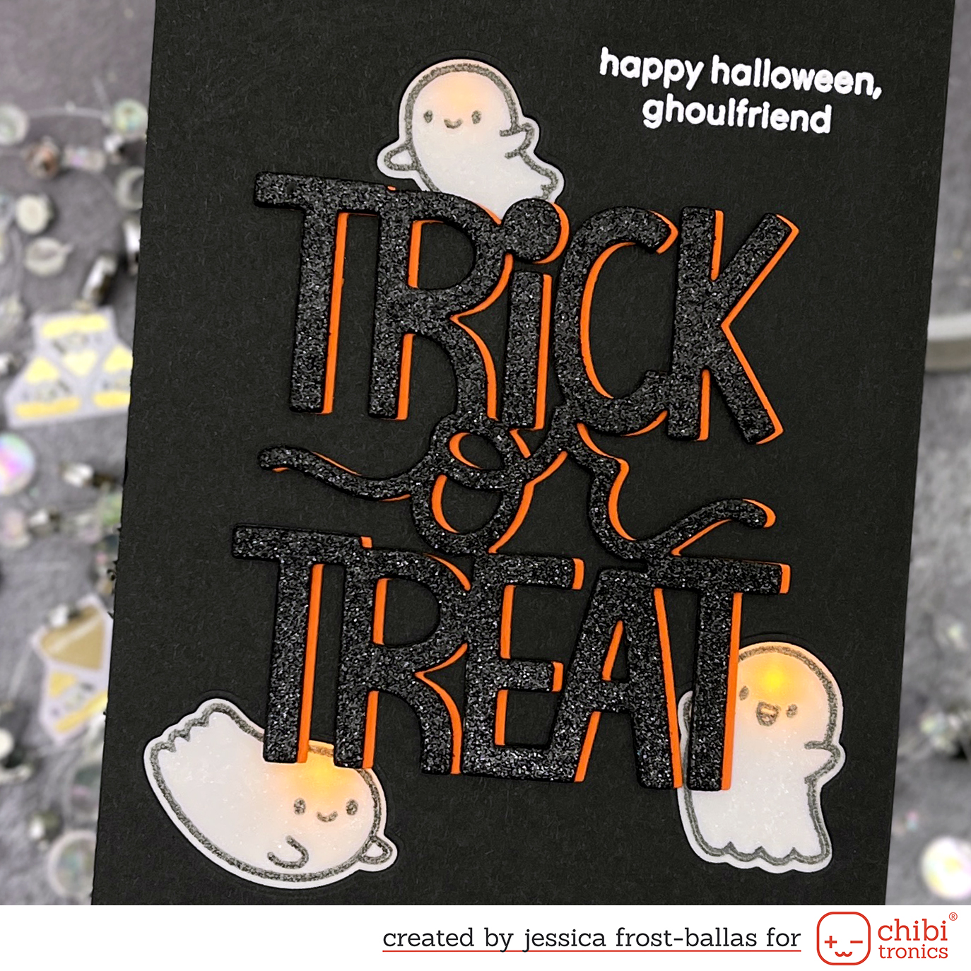 I created a simple card featuring some cute light up ghosts! I started by die-cutting three ghosts from a panel of black cardstock. Then I stamped the three ghosts onto vellum with versafine and heat-embossed them with clear embossing powder. Before adhering the ghosts I placed the die-cut panel over a second panel of black cardstock and stamped the ghosts in the openings with white pigment ink to use as a reference for my light circuit later. I adhered the vellum pieces behind the openings in the black cardstock and added another layer of vellum to diffuse the Chibitronics stickers a little more. I also stamped a sentiment from Ghoulfriends on to the top right corner of the black cardstock panel and heat-embossed it with white embossing powder.