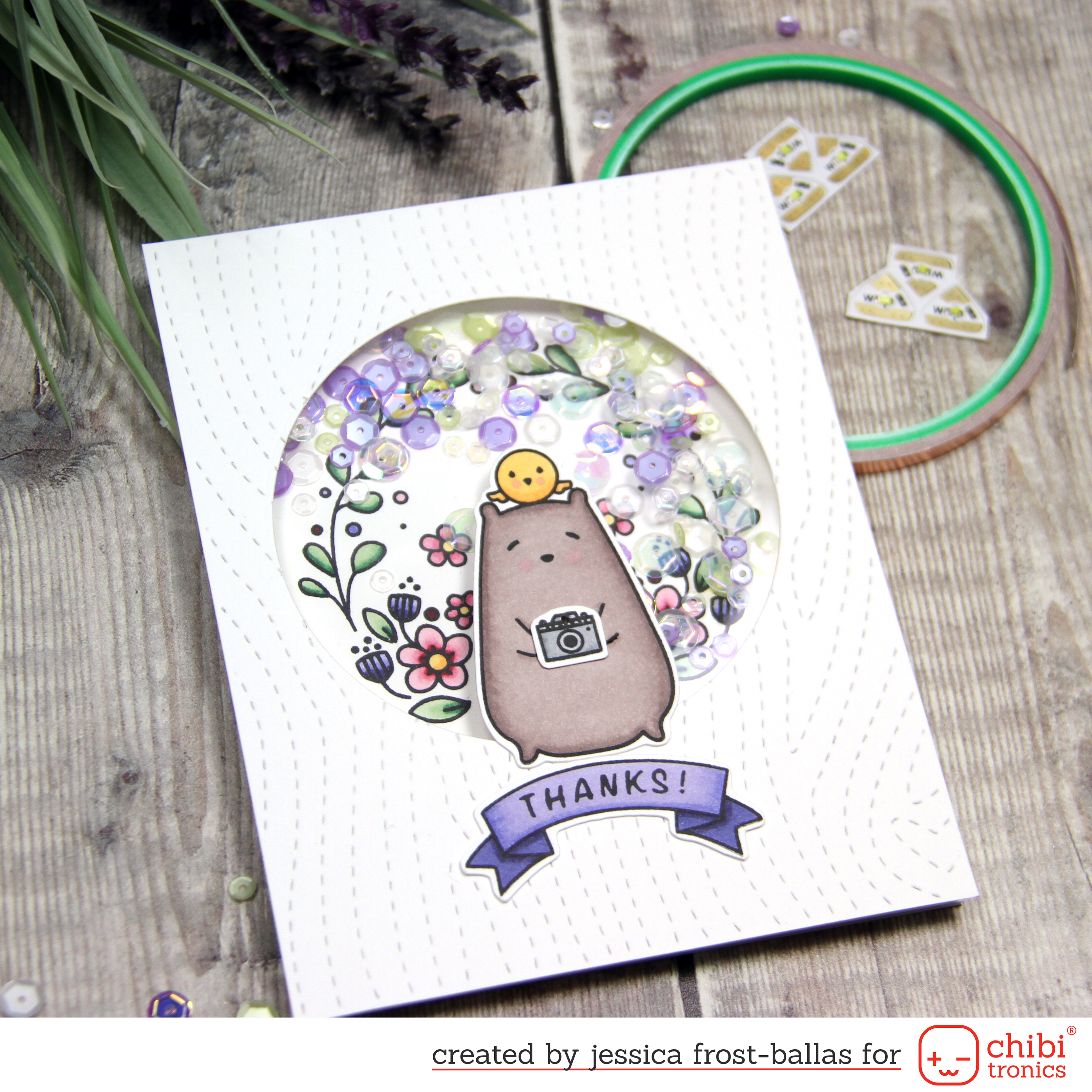 Next I created my circuit on my background panel (with the floral stamps) and then built up the shaker frame with three layers of foam mounting tape (this is not a flat card)! I filled the shaker with the Wisteria and Sparkling Clear sequin mixes from Pretty Pink Posh and then adhered the top panel over the shaker to seal it. When you push down on the banner the camera flash lights up!