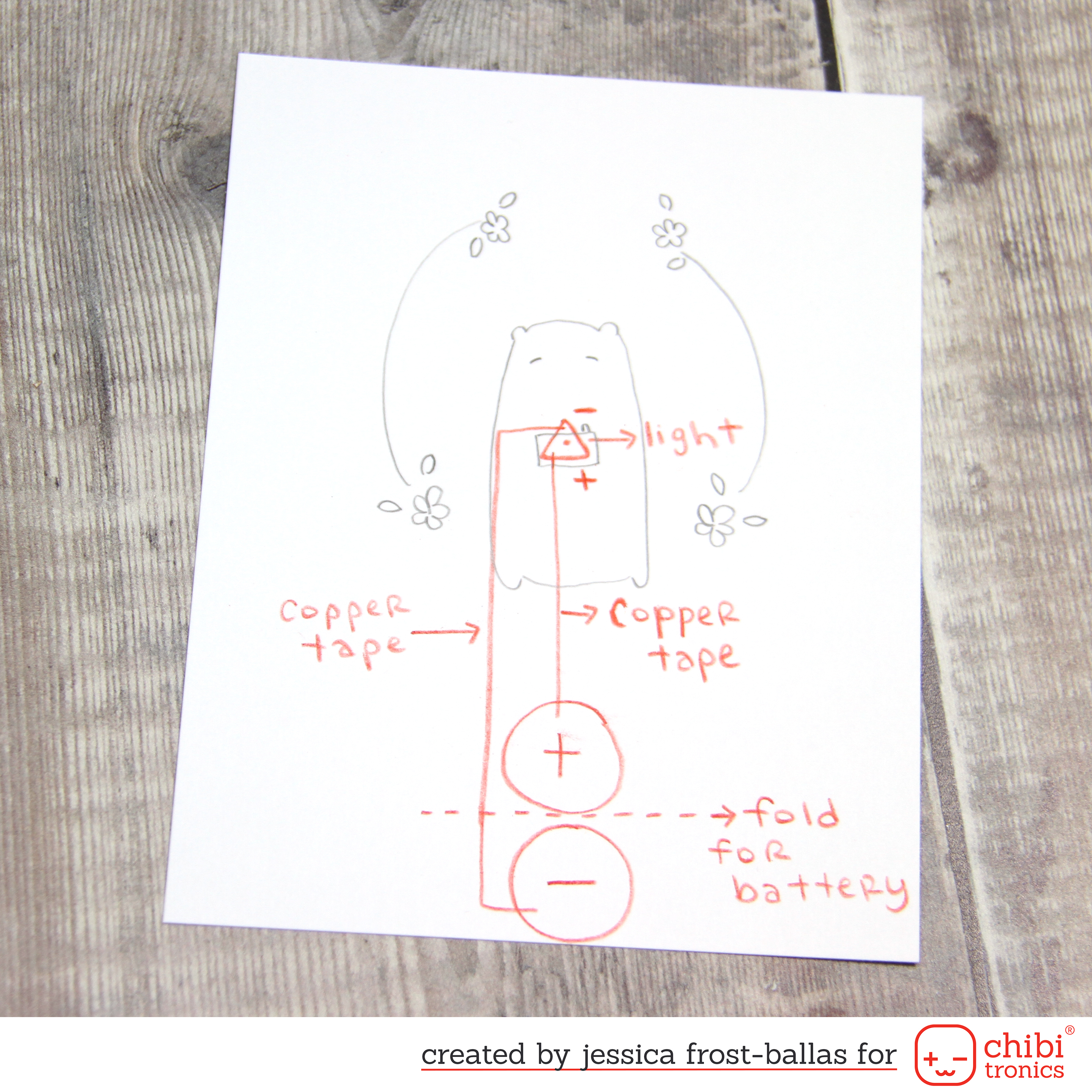 I started by stamping the adorable Bear and Bird images from Waffleflower onto cardstock with copic-friendly ink and colored them with copic markers. I used my ScanNCut to cut out the bear, camera, and banner. Then I ran a panel of white cardstock through my Bigshot with the Woodgrain Cover Up die from Lil’ Inker Designs and then die cut a circle from the panel for my shaker. Next I sketched out my circuit…unfortunately I forgot to take a photo of my completed circuit before I sealed the shaker but hopefully you can get the idea from my rough sketch: