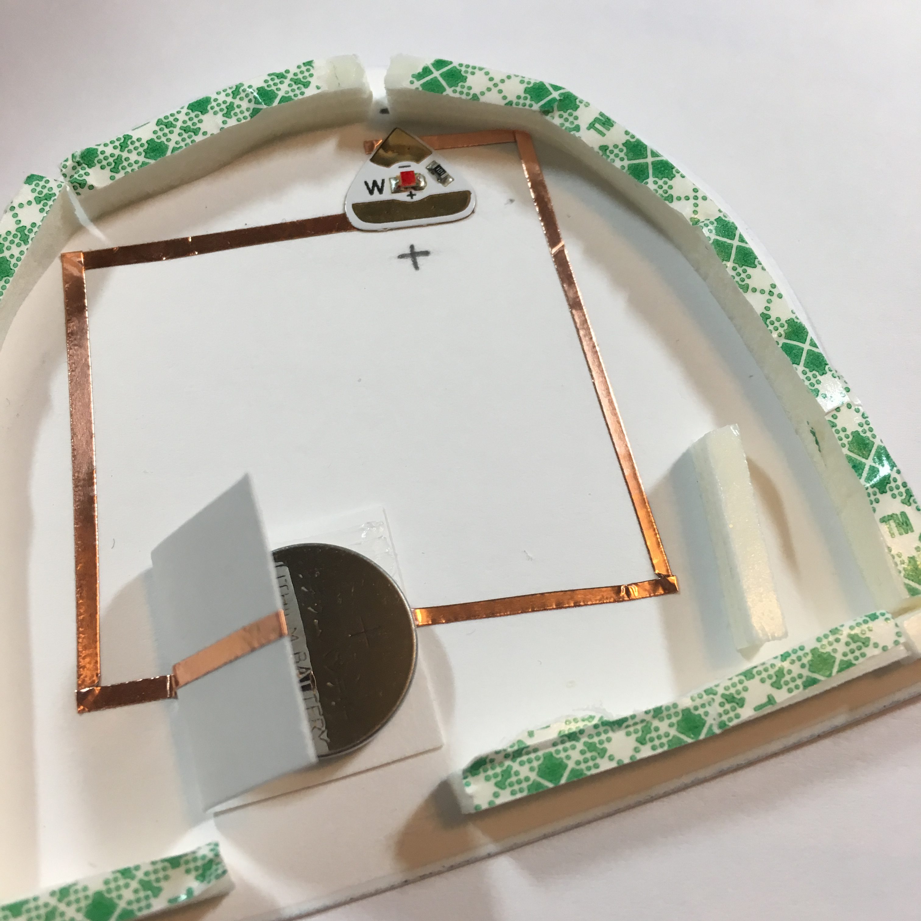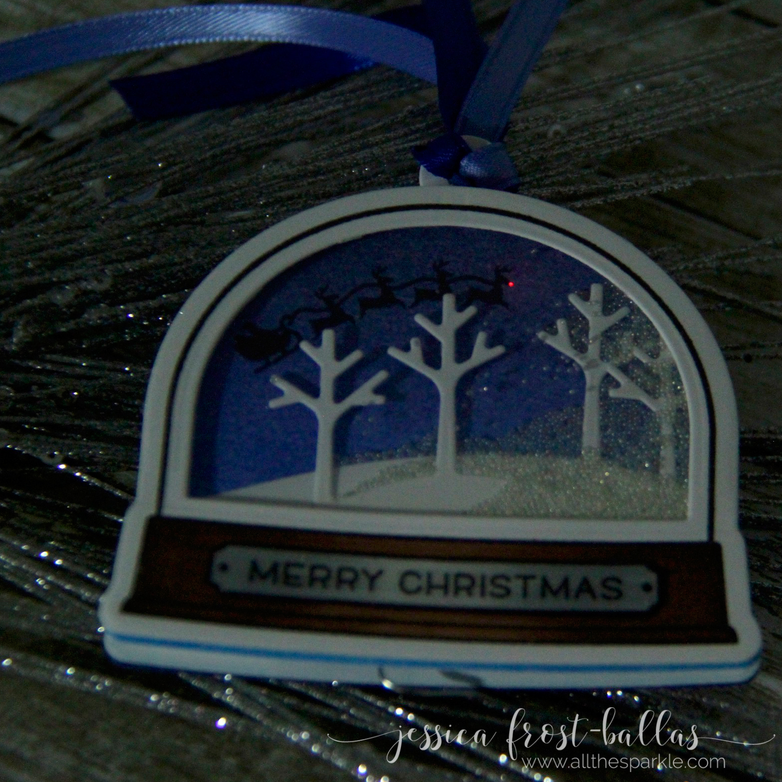 It’s a pretty thick tag (4 layers of foam mounting tape and three layers of cardstock!) but it’s perfect as an ornament! I started by stamping the snow globe and coloring it with copic markers. I added glossy accents to the sentiment and set it aside to dry. Next I blended distress ink onto a piece of watercolor paper and then stamped the reindeer and sleigh. I took a pin and poked a hole for Rudolph’s red nose. I created the shaker with white microbeads and dies and sealed it up. Next I created a circuit for my shaker:
