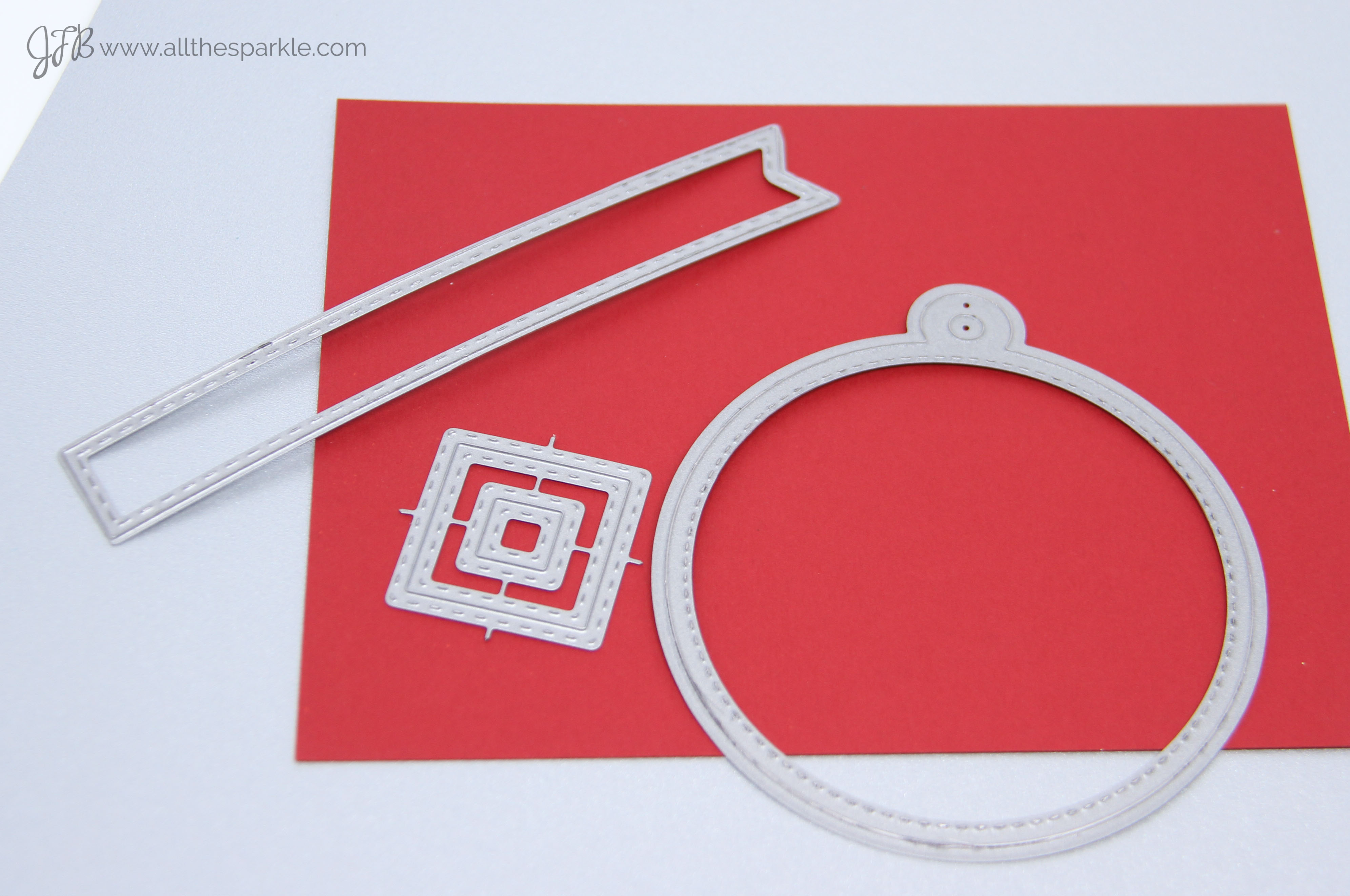 I saw it and laughed because I still have yet to get any Santa stamps…I have santa hats and a ton of reindeer but no actual santas. So I decided I’d make Christmas tags and I’d figure out a way to make it work with some of my dies. I ended up with a stitched fishtail banner, a round tag die, and two stitched square dies that were still attached by wires…
