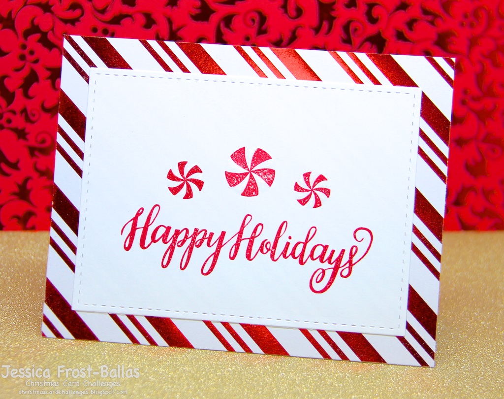 After my last semi-disastrous attempt at making Christmas cookies on a card I decided to use the candy cane cookies for my inspiration! I die-cut a panel of white cardstock with the Stitched Rectangles die from Simon Says Stamp and then used my MISTI to stamp the small candies from a My Favorite Things set and the large candy and sentiment from a Mama Elephant set with red pigment ink. I heat-embossed the pigment ink with clear embossing powder to get a little shine. Then I went over the white areas of the candies with my Gelly Roll white glaze pen which leaves a raised edge when it dries.
