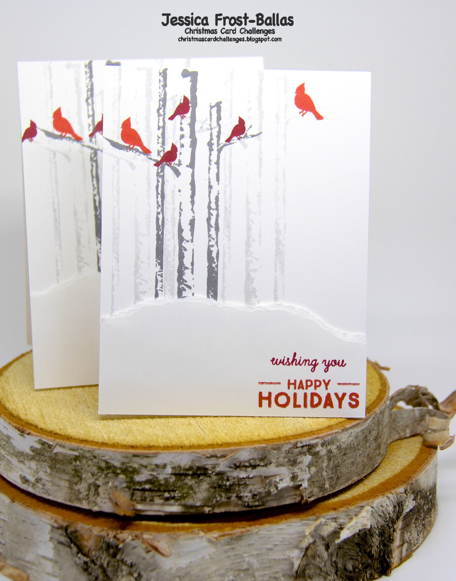 I used repeat stamping to get the lighter gray shades for the birch trees which help to create a little depth and dimension. I stamped the cardinals in two shades of red and then used those same two shades to stamp the sentiment. The sentiment was stamped on a piece of white cardstock which I tore to create the snowbanks. I really love how this card turned out…it would be very easy to mass-produce and the pops of red really stand out. To finish the card I added a little wink of stella clear glitter to the cardinals!