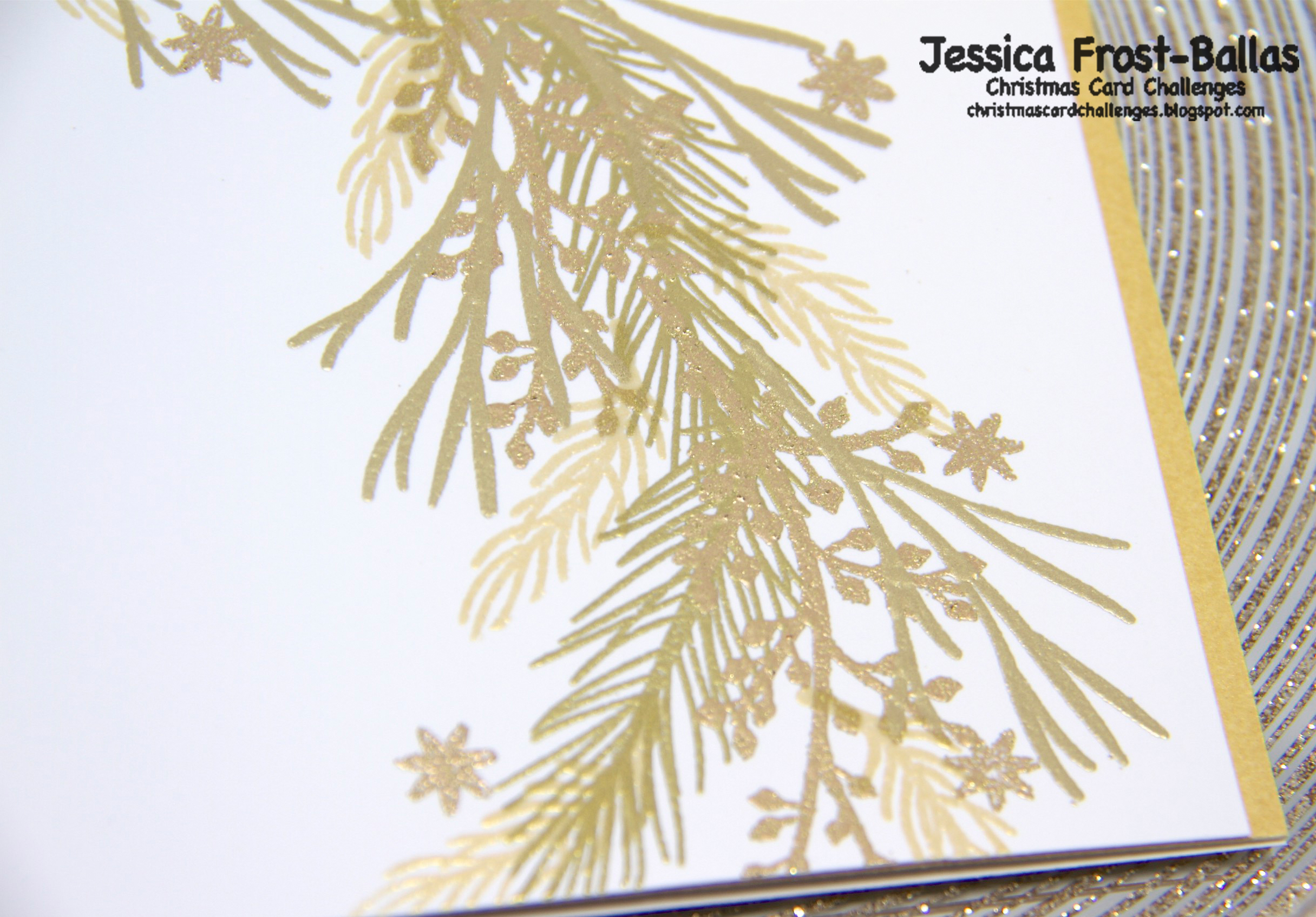 To create my card I stamped branches from the Hero Arts Holiday Pine Branches stamp set with versamark and heat-embossed each layer with a different embossing powder. I used the following embossing powders: Hero Arts Gold embossing powder, Ranger Gold Tinsel embossing powder, Ranger Princess Gold embossing powder, WOW Metallic Gold Rich embossing powder, and WOW Gold Pearl embossing powder. I love the pale shimmer of the gold pearl embossing powder and the extra sparkly texture of the gold tinsel embossing powder. The other three shades of gold were all slightly different which created a really cool effect. You can see the differences a little better in the up-close photo below though it’s really noticeable in person.