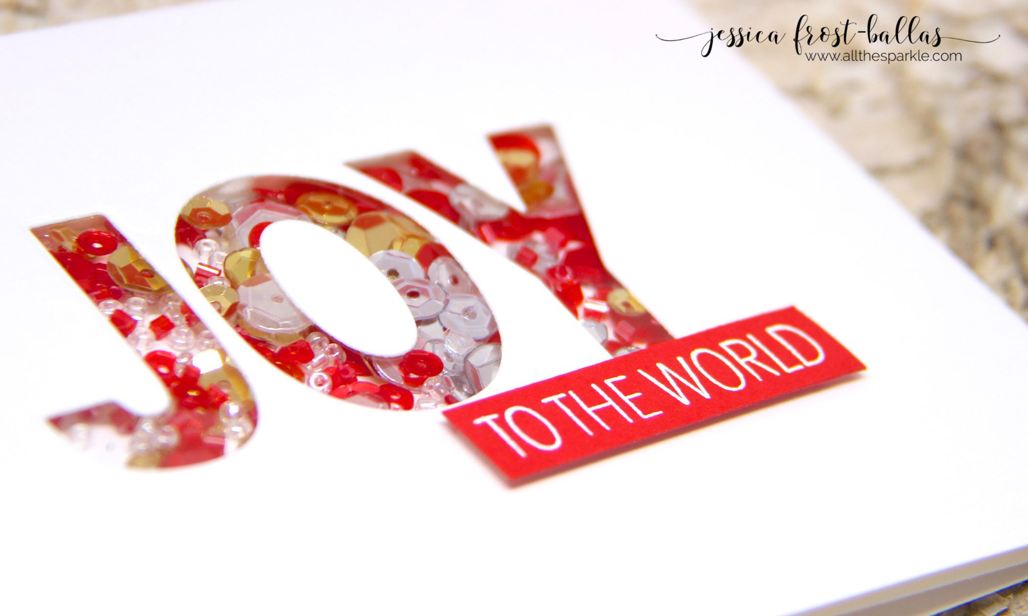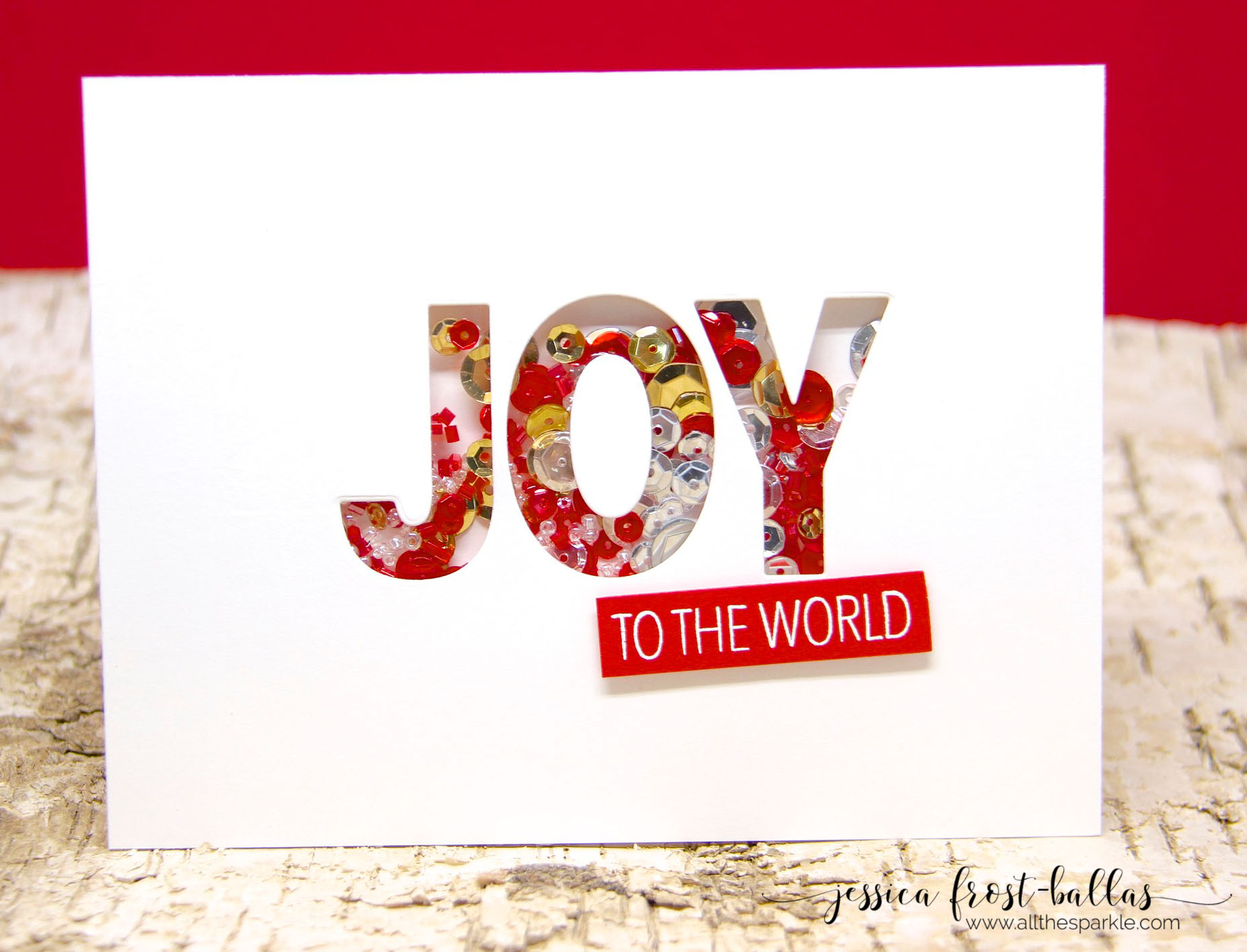 My next card is also CAS but it’s a shaker, my all-time favorite card to create! I die-cut the Joy word from the center of a piece of white cardstock and then filled it with red, silver, gold, sparkling clear sequins and red and clear seed beads.