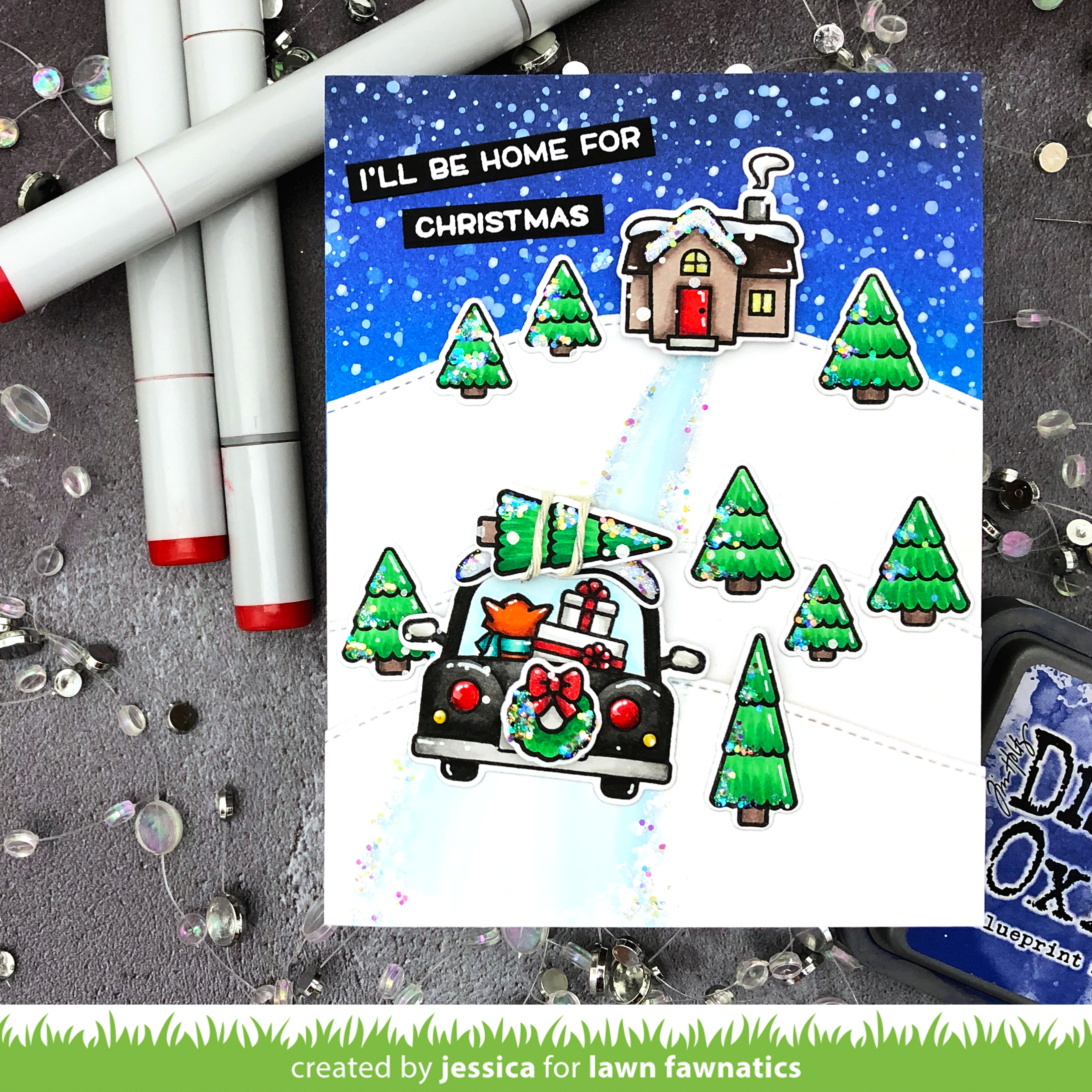 Good morning! This week is Lawn Fawn’s Fawny Holiday Week and today I’m sharing a Christmas Scene card with Car Critters! 🙂 I’ve altered the stamp slightly to give it a different look and I’ve added a little freehand copic sketching to create my holiday scene! 🙂