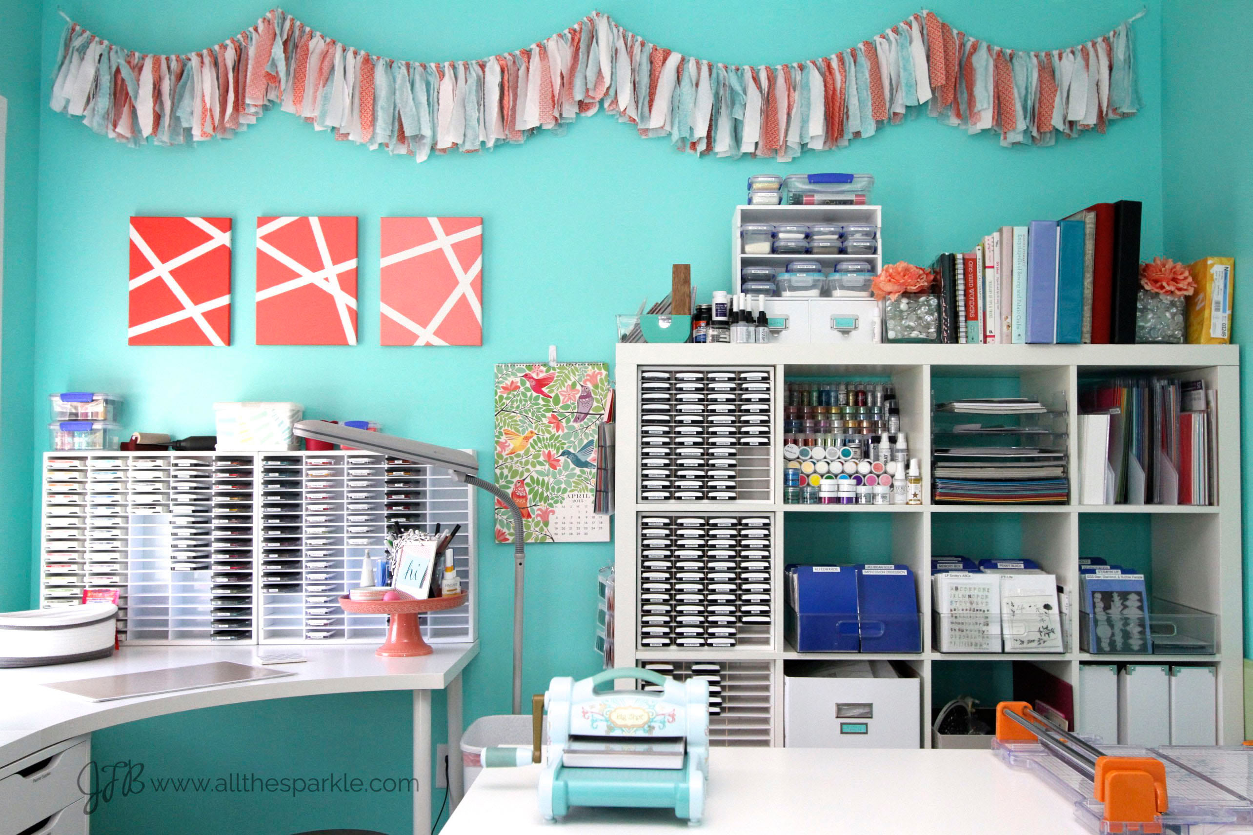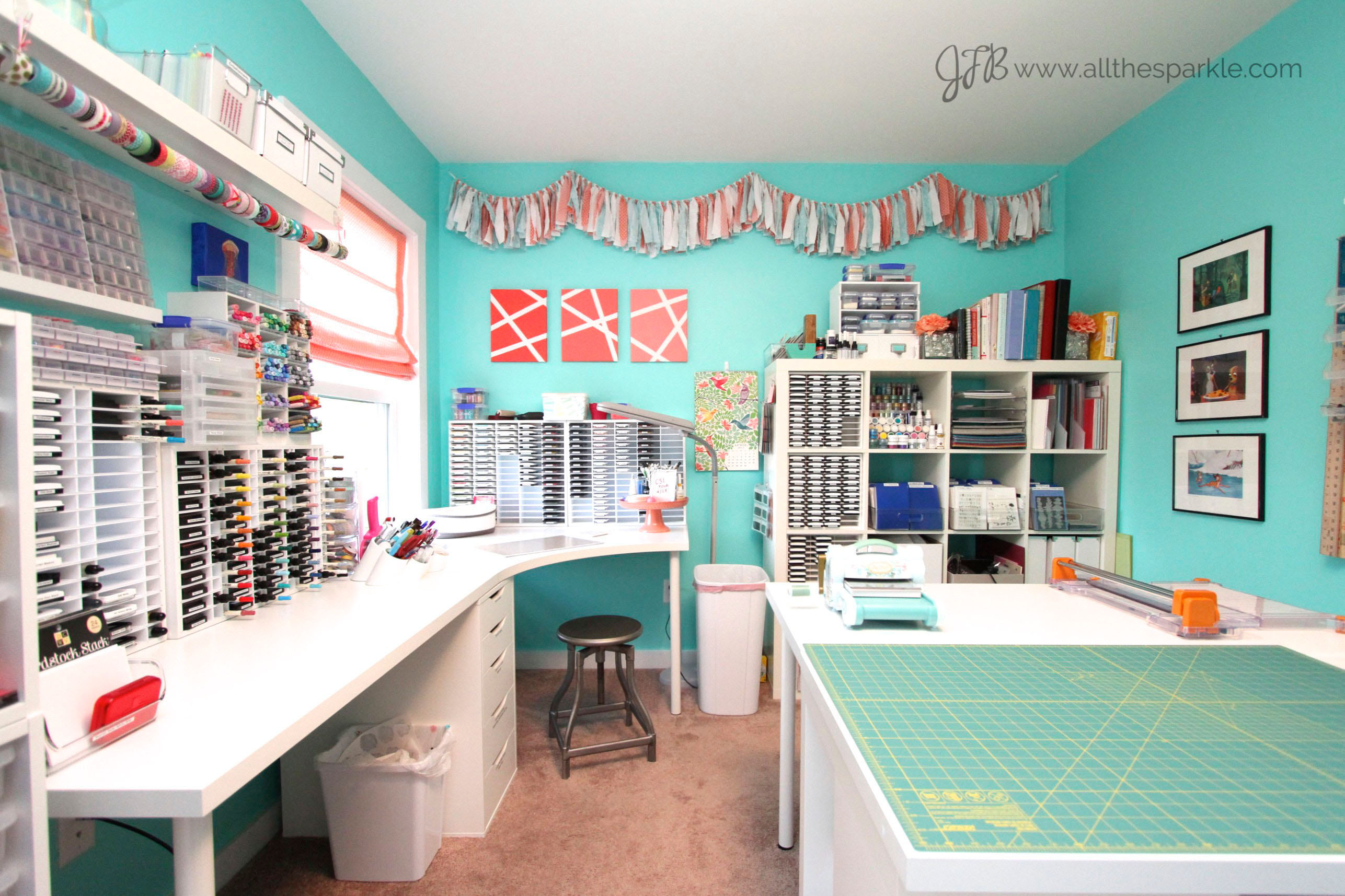 My husband and I built our first home in the summer of 2013 and I spent months browsing Pinterest for ideas for my craft room. I knew this was one room where I could go a little color-crazy so I decided on a coral, teal, and white color scheme. The wall paint is Sherwin-Williams Tantalizing Teal and I love how bright and cheery it feels. I chose Ikea furniture for the price point and for the variety of styles that were available. I use three Linnmon tabletops and one corner Linnmon tabletop for my main papercrafting workspaces and my husband and I constructed a table from a hollow-core door for my gift wrapping and mailing workspace. I used different bases to support the tables…Alex drawers, table legs, and Ullrik units which give me a lot of versatile organization space. In the future I’m hoping to get glass cut to fit the top of the tables for even easier clean-up.