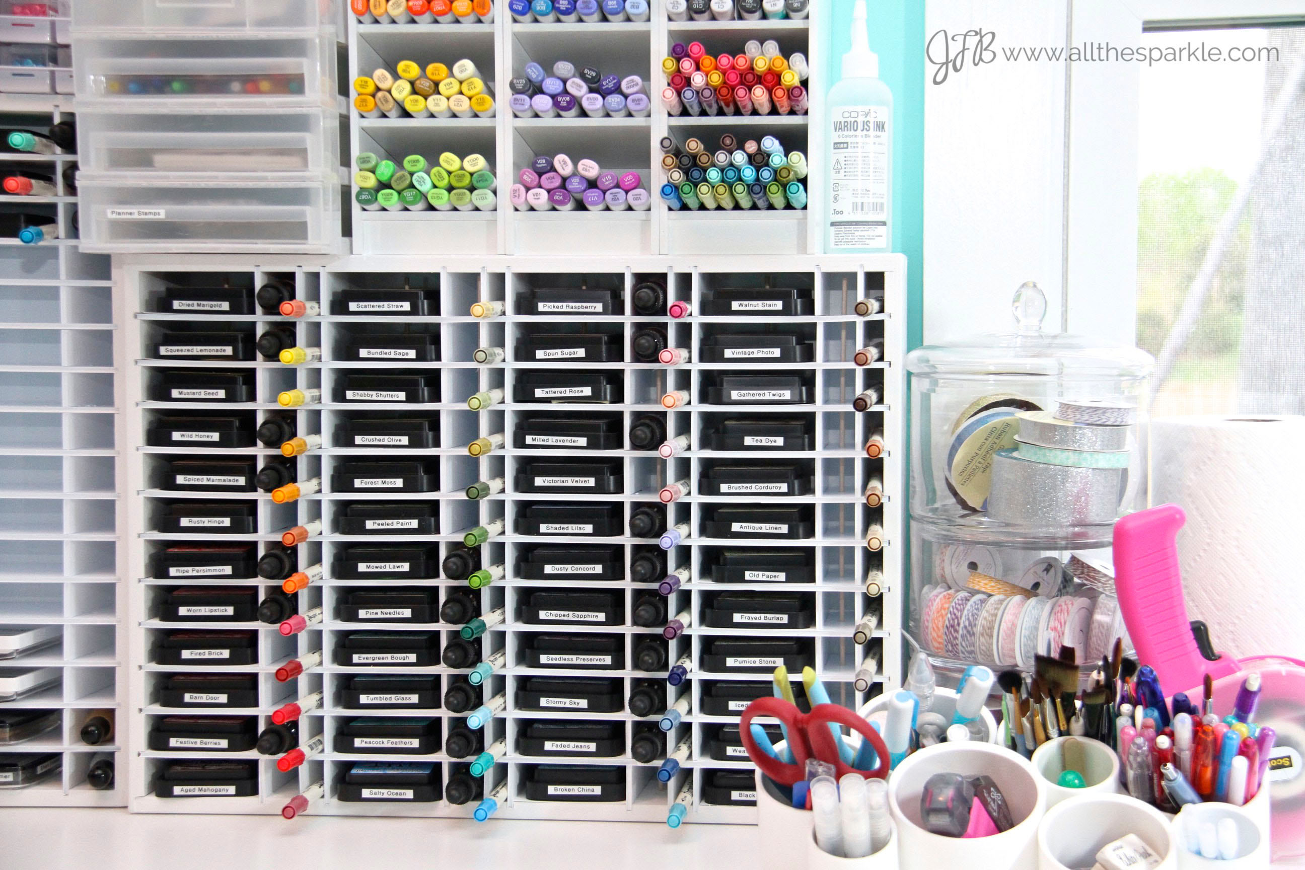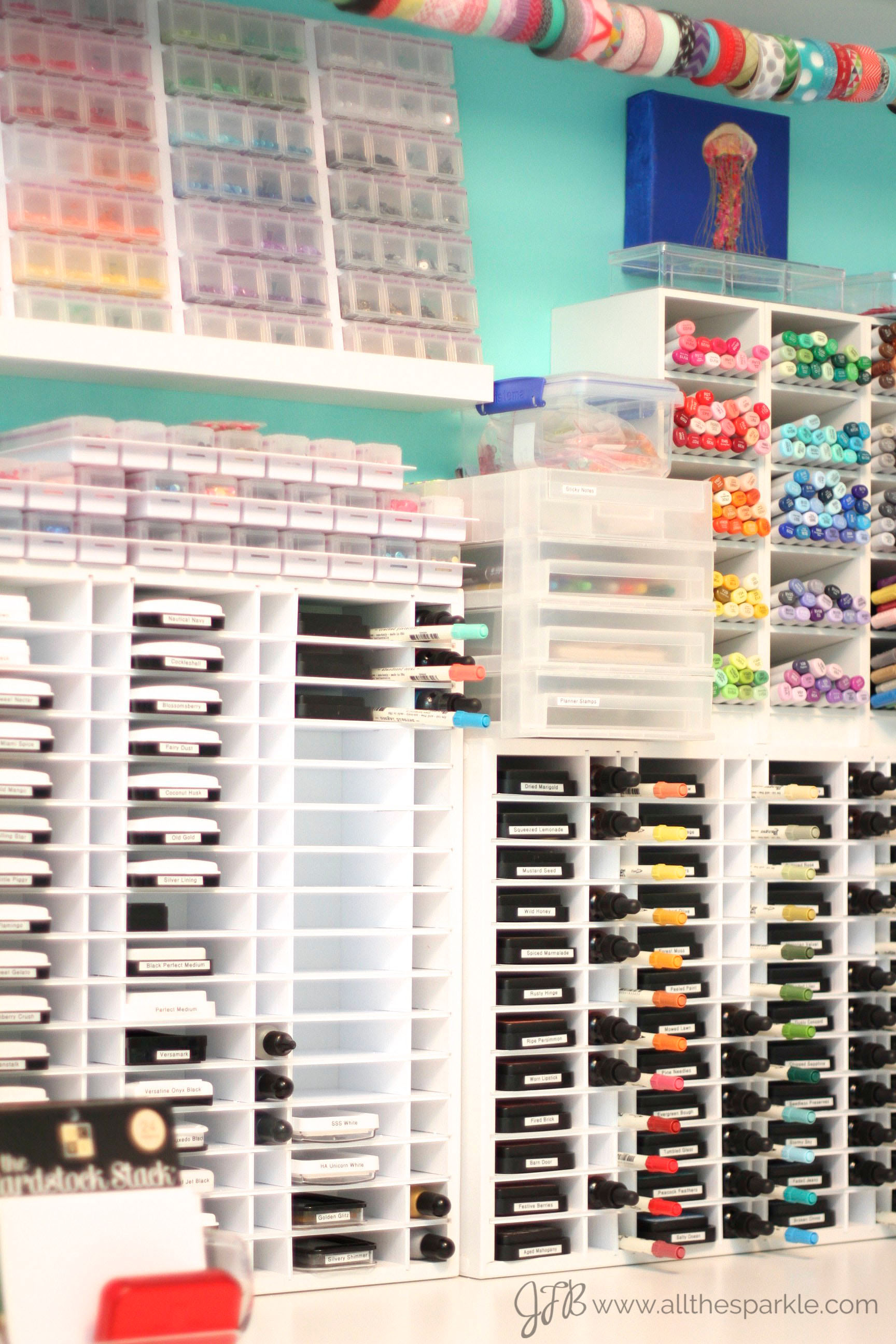 I use Organize More units to store all of my ink pads, reinkers, and distress markers. I store my copic markers in Color Cubbies which are, unfortunately, no longer available as I believe the business has closed. If you’re a regular reader of my blog you already know that I’m a big fan of color and sparkle and this wall of my room is one of my favorites. It houses my copic markers, washi tape, distress inks, and 238 different shades and sizes of sequins!