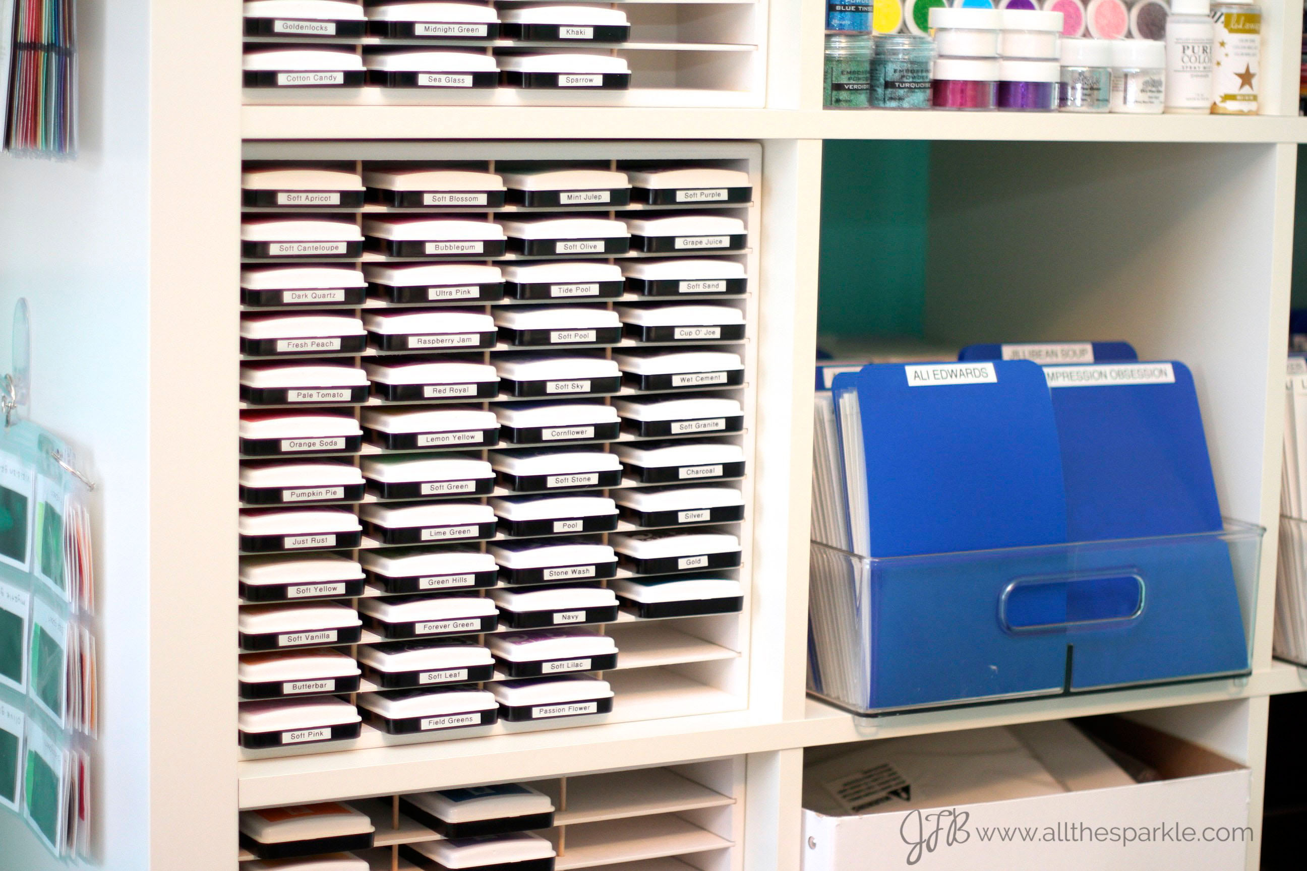 Organize More recently built me 3 custom ink pad storage units to fit into my Ikea Expedit (they will also fit in the new Ikea Kallax) which has opened up a whole new world of possibilities and I’ve heard that Organize More will be offering the Expedit/Kallax units soon! I will readily admit that Jennifer McGuire is a huge source of organizational inspiration so many of my storage systems are reproductions or adaptations of hers (as you can see with my stamp storage, ink swatch book, and peerless watercolor swatch book below)! On my Expedit I store my embossing powders, glitters, stickles, dye inks, stamps, embossing tools, and cardstock/paper.