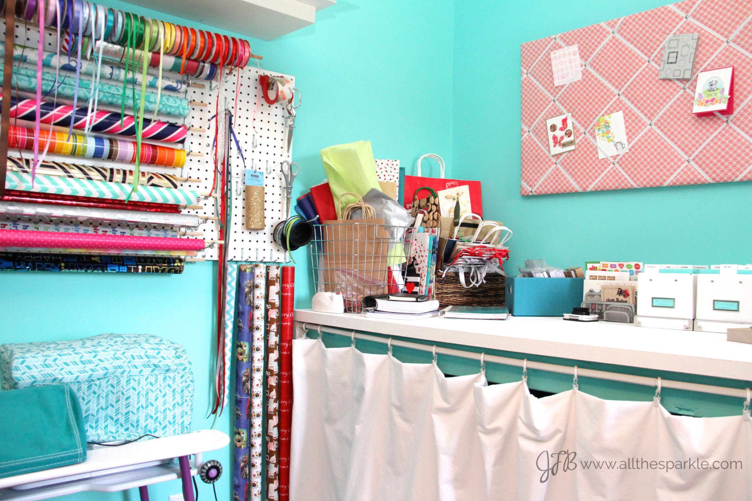 My most recent craft room addition is a second pegboard and a gift wrapping/packaging table.