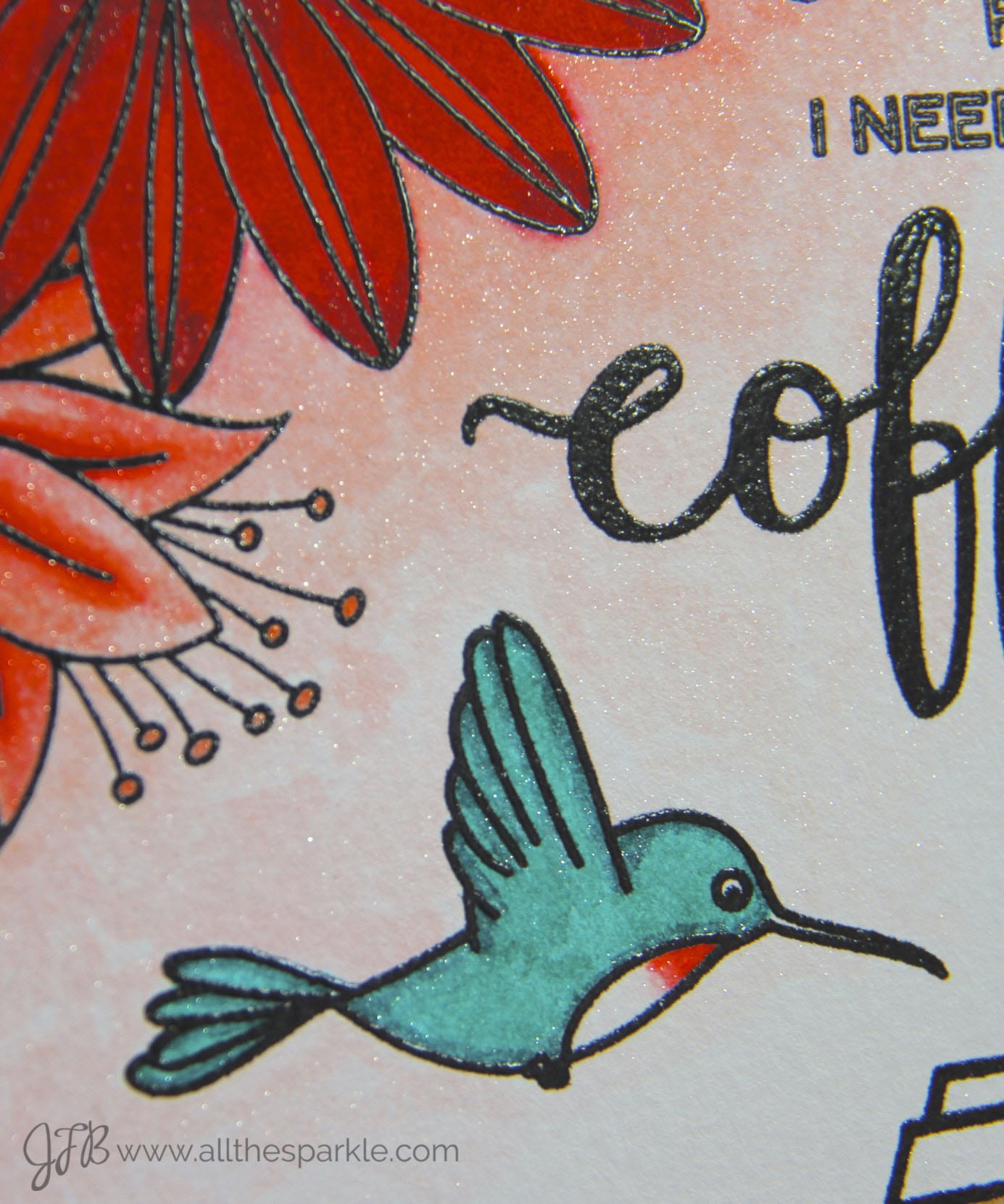 Next it was coloring time! I recently purchased the Kuretake Zig Clean Color Real Brush markers and was eager to give them a try! I used them in several different ways…for the large flower, hummingbird, and coffee cup I colored the images directly with the markers and then blended them with a clear wink of stella glitter brush. For the smaller flowers I colored two markers on an acrylic block, spritzed the ink with water for a softer look, and painted the color onto the images with a water brush. Finally I spritzed even more water onto the leftover ink on the same block for a really light reddish pink and painted the background using the clear wink of stella glitter brush. Unfortunately it’s difficult to get a photo of the shimmer but you can see some of the sparkle in this photo: