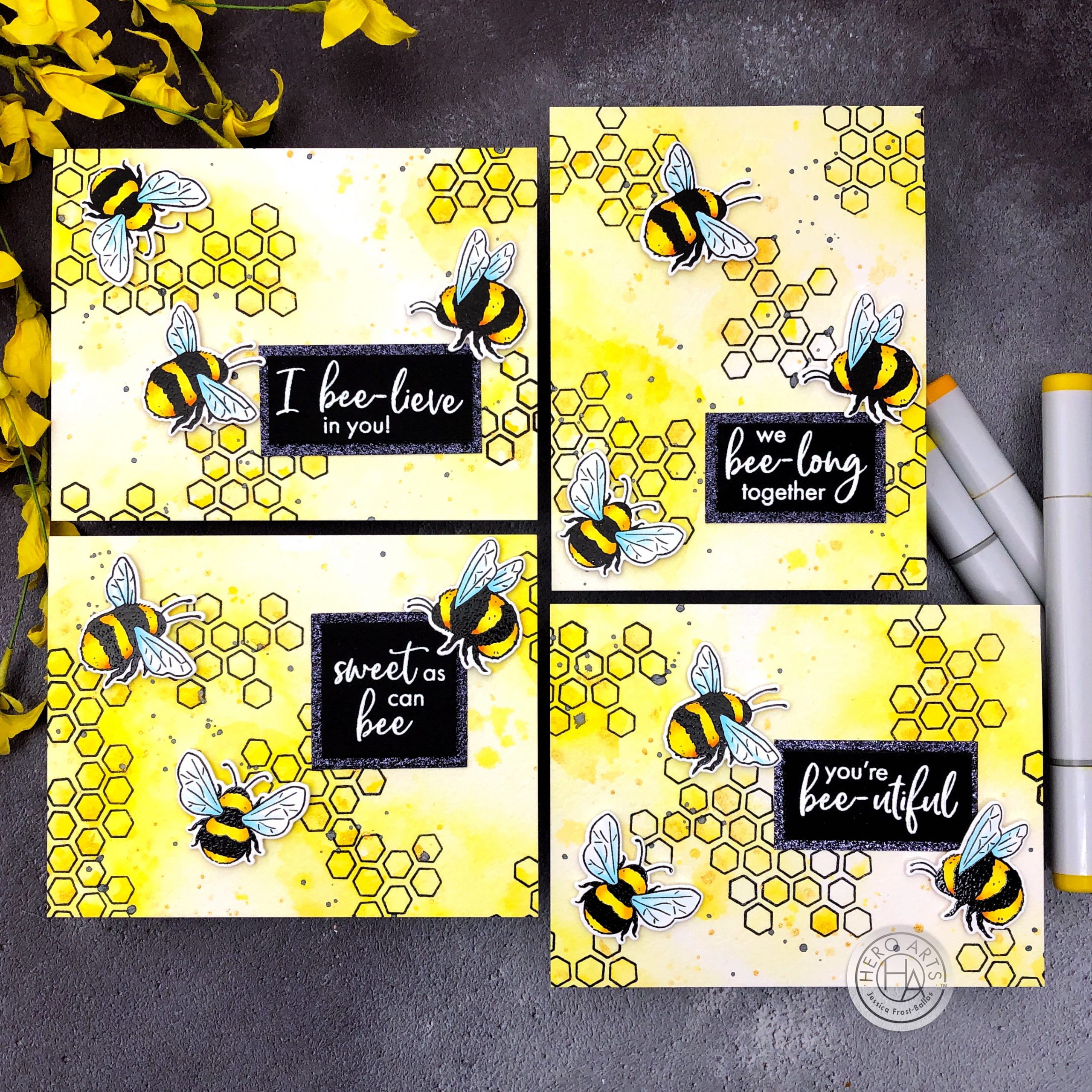 Beautiful cards! I love your bee cards! So clever with the multiple cards from one background! Wonderful new set from HA! Thanks so much for sharing and inspiring! Take care! 🙂