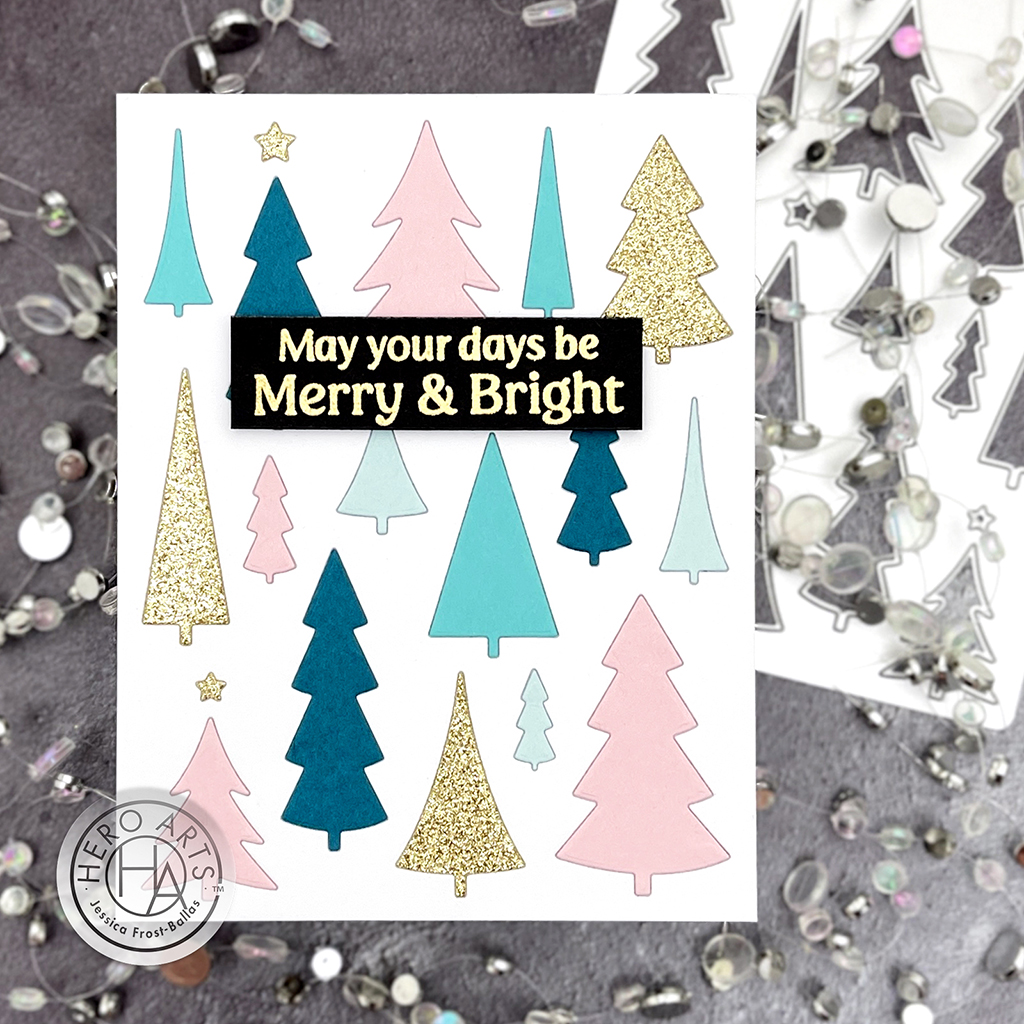 My first card uses the new Tree Pattern Cover Plate with some of my favorite Hero Arts cardstock colors for a dreamy pastel holiday card! I’m using Peony, Arctic, Paradise, Adriatic, and gold glitter cardstock and have randomly mixed and matched them across the panel! I actually created several cards using up all of the trees and background panels and I finished the card with a gold heat-embossed sentiment from Winter Foliage Stamp & Cut XL!