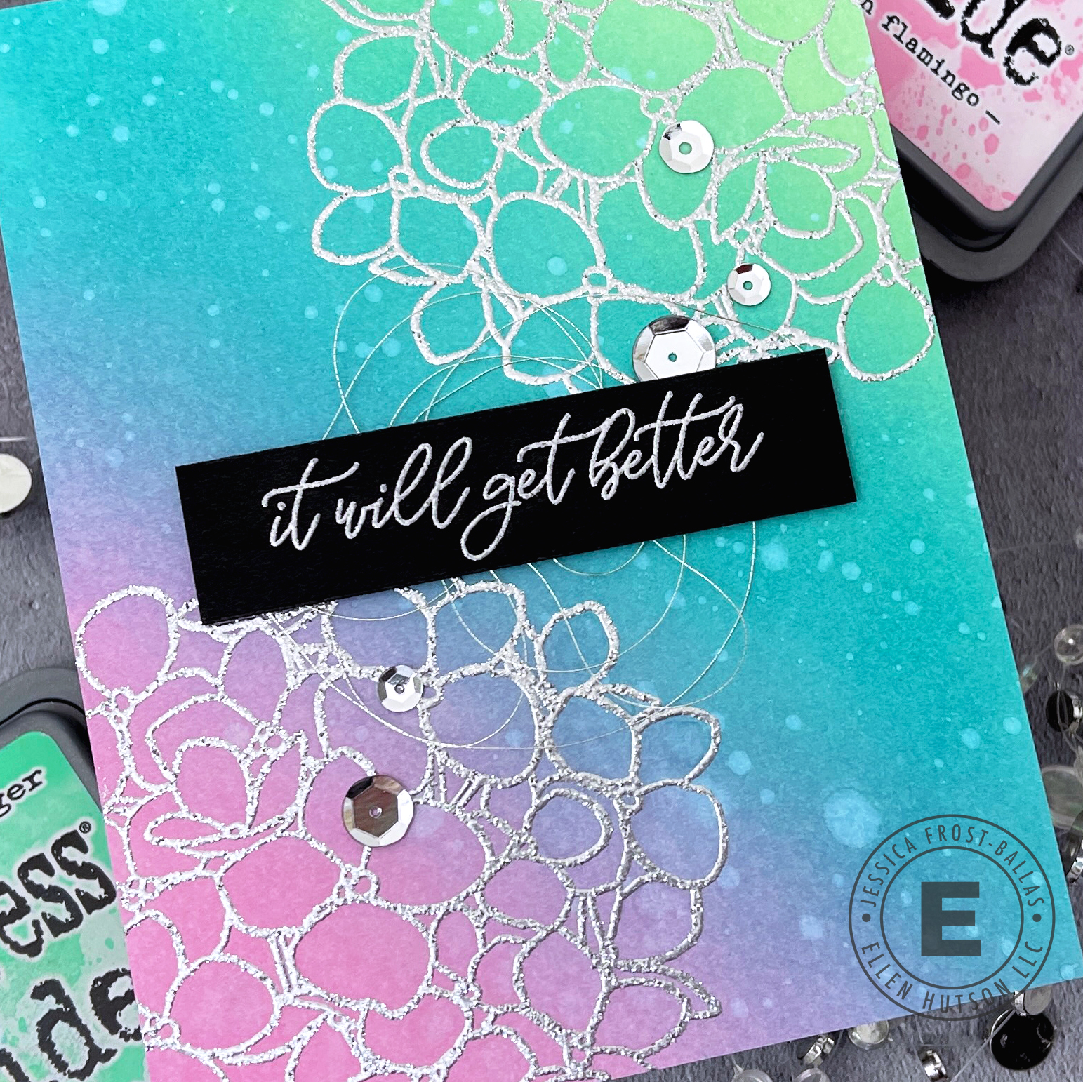 I stamped the Mondo Hydrangea onto two corners of the panel and heat-embossed them with silver sparkle embossing glitter. I added a sentiment from Better Days Ahead heat-embossed on black cardstock and then finished the card with a tangle of metallic silver thread and some silver sequins! It’s a simple design that you could use with any variety of ink blending combos and sentiments!