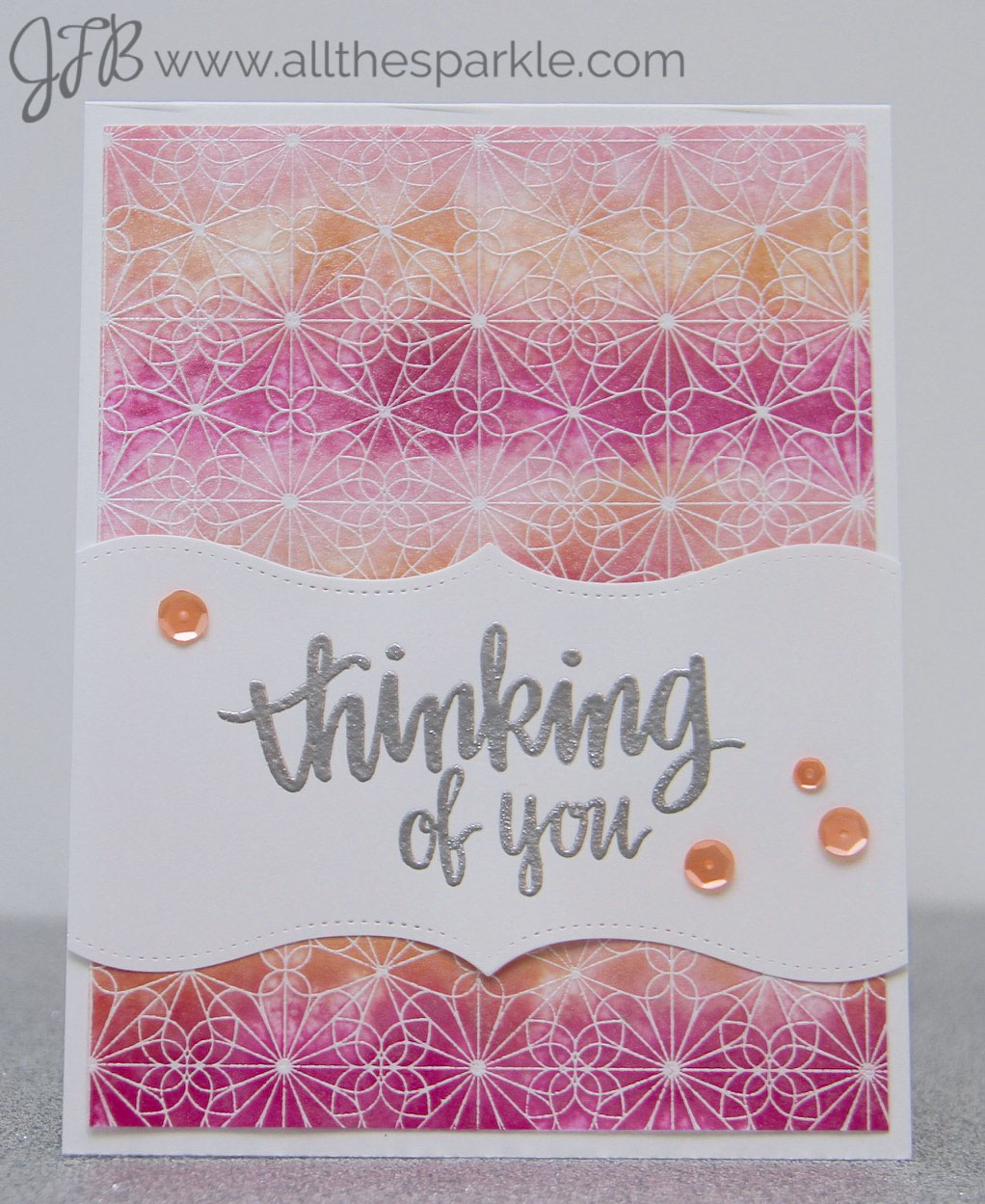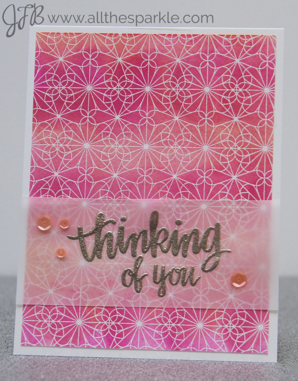 I tried out the blue pad by inking the new Hero Arts Garden Tile background stamp and stamping it on Neenah Solar White cardstock. I really like how it turned out and I’ll definitely spend more time with it later but I mostly focused on the pink pad today. Ha, I had to finish quickly enough to have time to watch Grey’s Anatomy and Scandal! #tgit