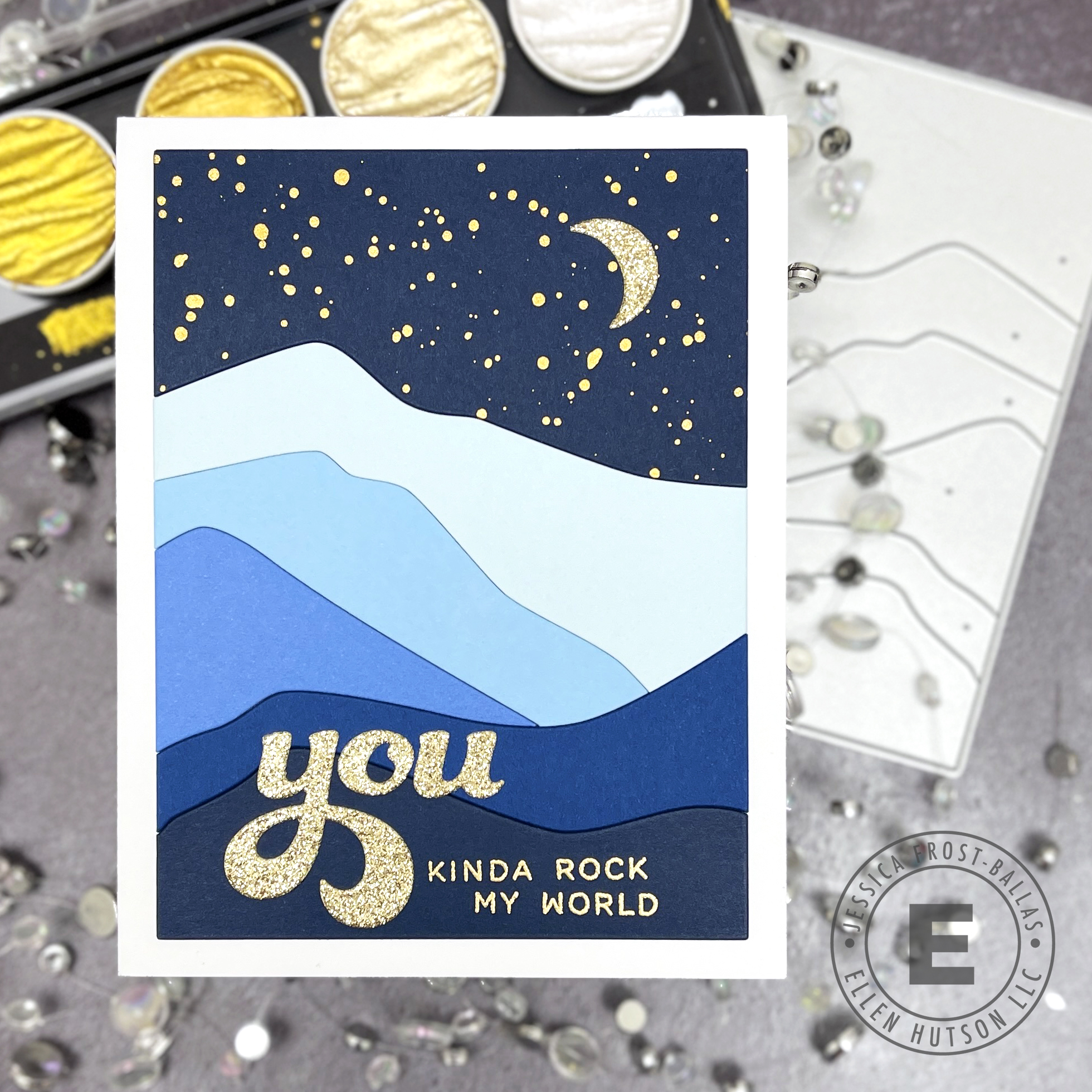 My first card is inspired by the Blue Ridge Mountains and I used a variety of blue cardstocks to paper piece the Abstract Mountain die set together! From light to dark I used scraps of Bazzill Icy Mint, Lawn Fawn Moonstone, Hero Arts Lapis, Lawn Fawn Blue Jay, and Concord & 9th Midnight cardstocks and then adhered them to a white card base.