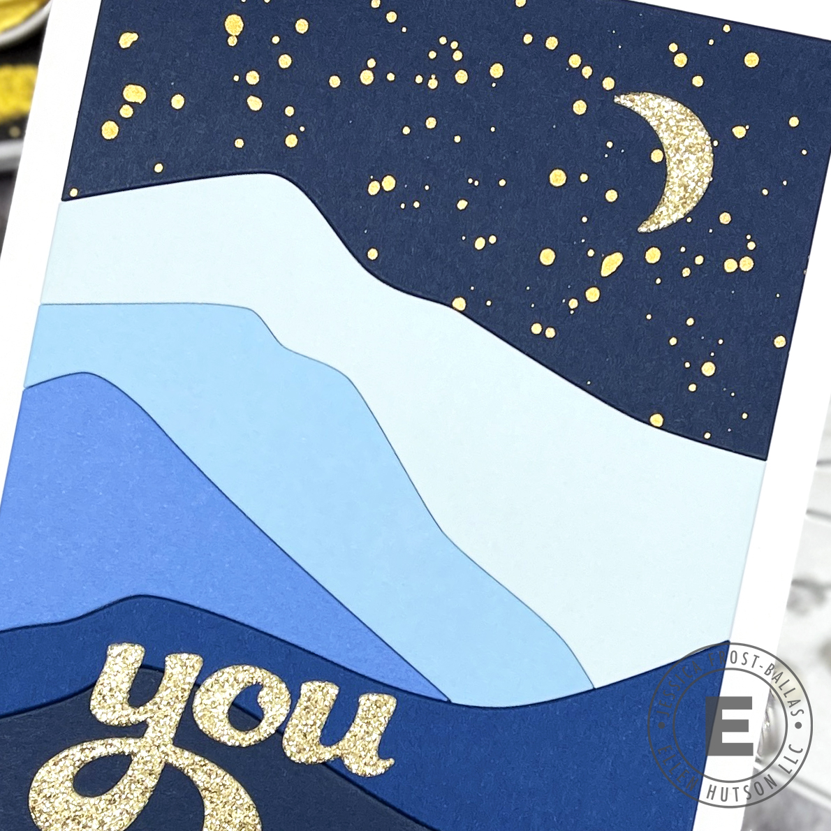 I die-cut the moon and ‘you’ sentiment from Gold Glitter cardstock from Tonic Studios and splattered the night sky with Finetec metallic gold paint. Finally I cut the sentiment from All About You apart (!) and then stamp and heat-embossed it with gold embossing powder. I love the feel of this card and would love to recreate it in lots of different colors!