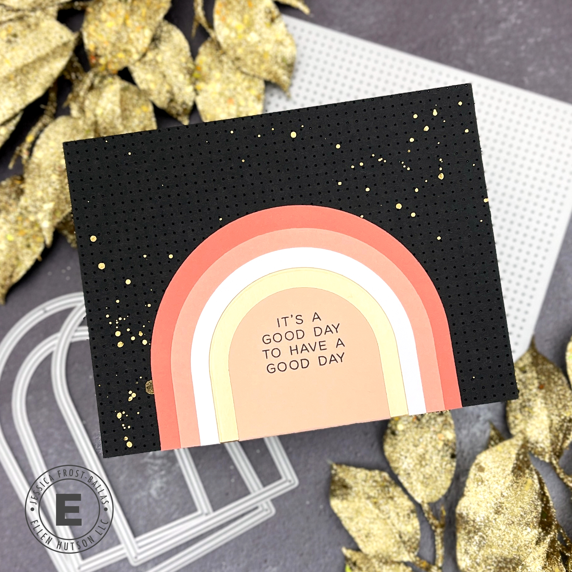 My second card is a little different from my usual style but I kinda love it! I die-cut the Arches dies from a variety of peach, coral, and gold cardstock and adhered them together to create a modified rainbow. I stamped a sentiment from Good Day with black ink. I kept the background simple by die-cutting the A2 Piercing Plate panel from black cardstock and splattered it with metallic gold paint. I love the texture and dimension it adds without any thread needed!