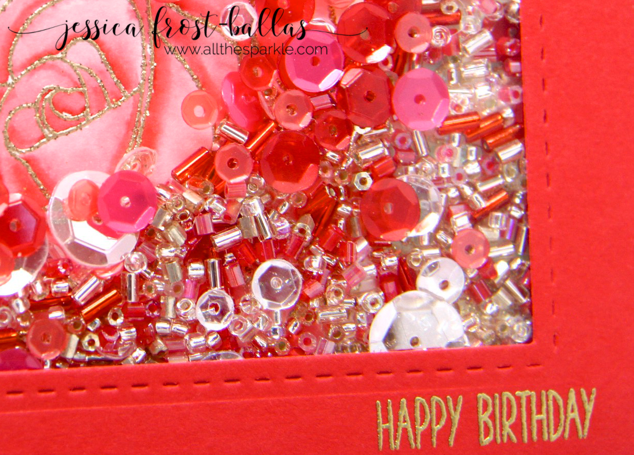 A few days ago I realized that I haven’t made a shaker card in a couple of weeks (the horror!!) so I decided I definitely needed to break out my gorgeous gilding from The Ton in Effie’s honor! I heat-embossed the Rose Garden cling background stamp with gold tinsel embossing powder and then colored it with zig clean color real brush markers. I stamped the sentiment from Hey Foxy onto the frame of my shaker and heat-embossed it with gold embossing powder. I used a variety of red, pink, and clear sequins and red, clear, and gold beads to fill my shaker! Look at all that sparkly goodness!! 😉 Nobody does sequins and beads like Effie!