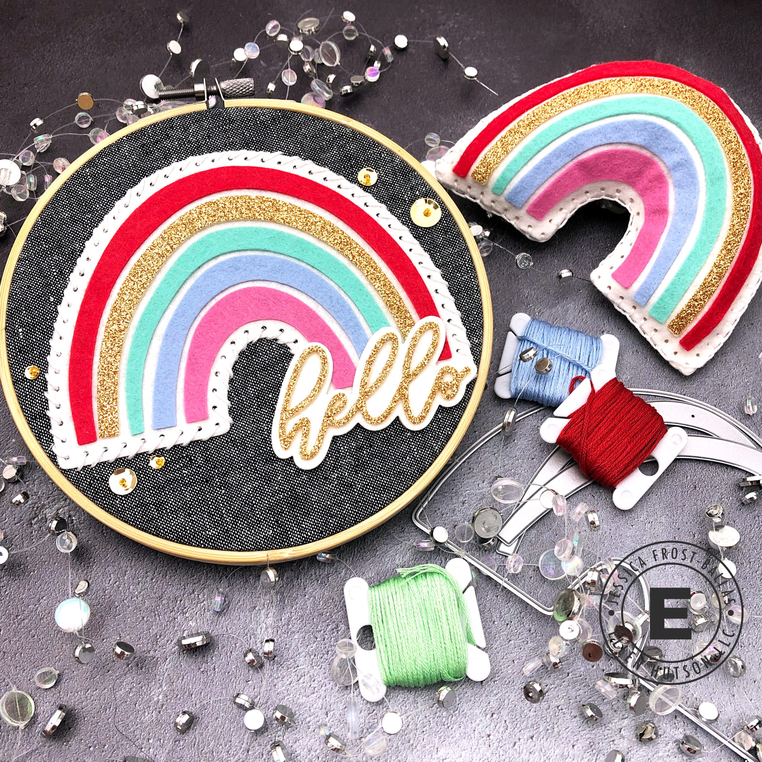 Isn’t that rainbow felt die adorable!?! It’s designed to create that cute little plushie on the right but I wanted to make myself a little craft room art so I also stitched it onto an embroidery hoop and added a sentiment from Ellen Hutson and a little extra sparkle! I already had a stash of felt from Benzie Design but Ellen Hutson also has a new Rainbow Felt palette available that’s perfect for this set! I also wanted to add a little sparkle (of course) so I found gold glitter felt on Etsy for one of my rainbow arches and the sentiment! I used Peel and Stick to make sure my felt would stick but you could also use a hot glue gun!