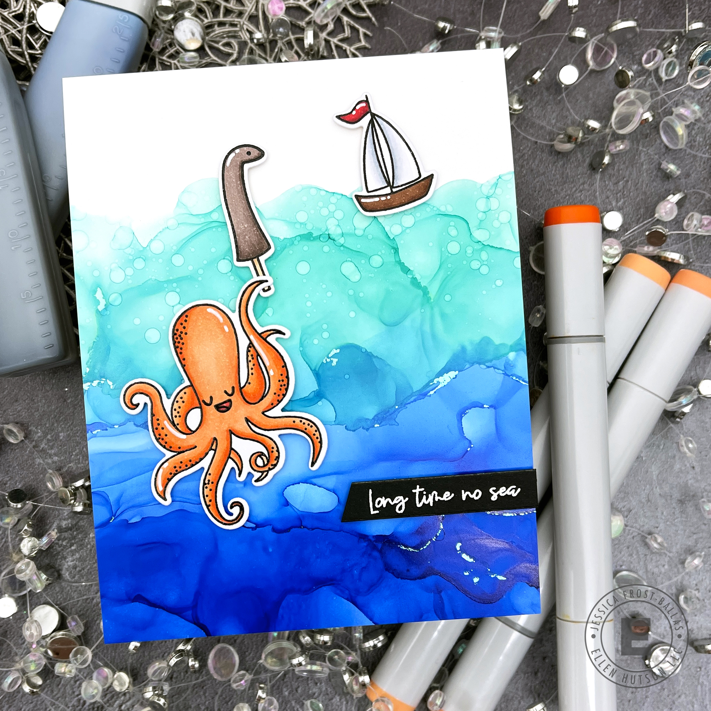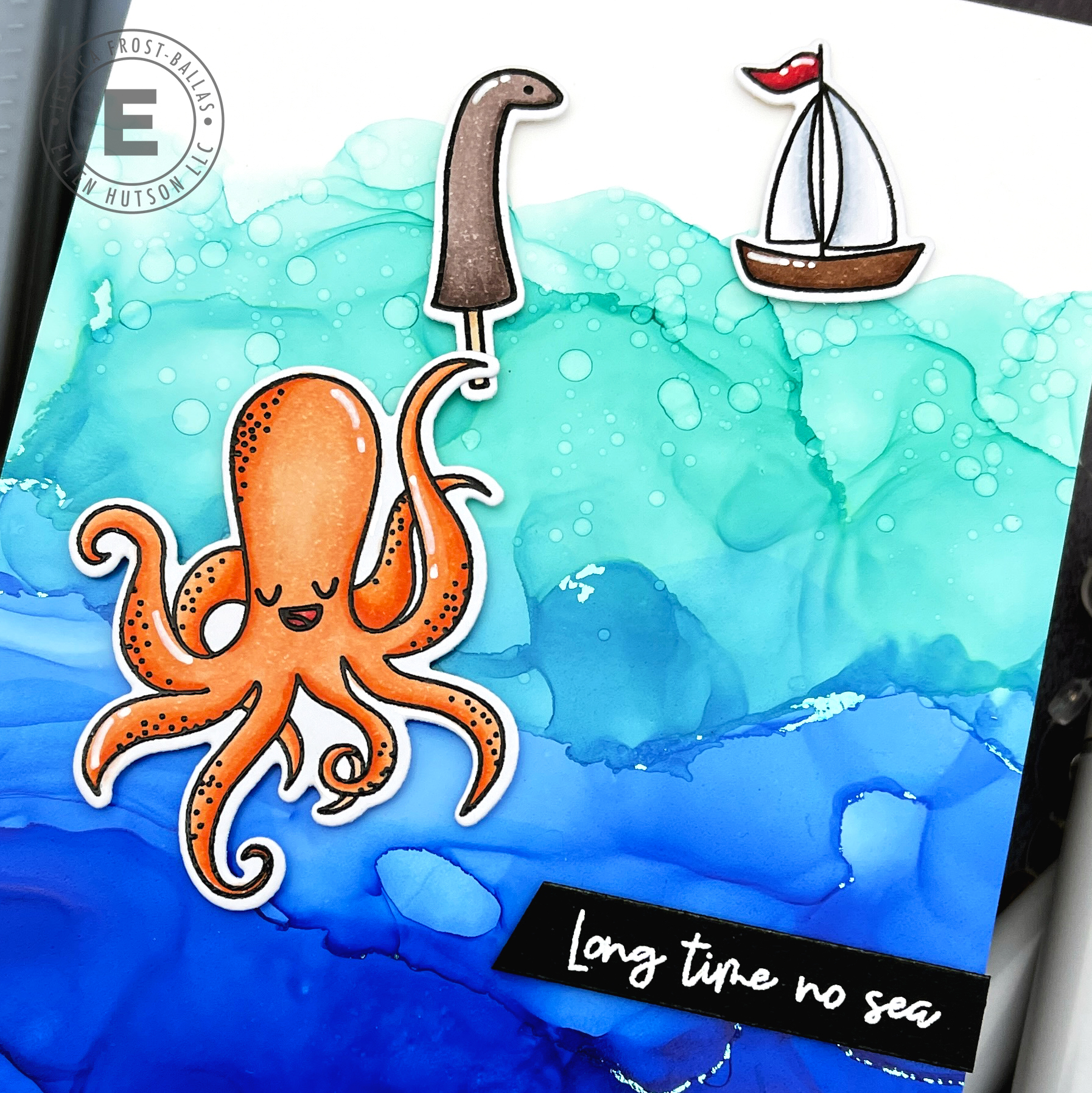 I stamped the octopus, his Nessie prop, and the sailboat from Just Squidding with versafine and heat-embossed them with clear embossing powder. I colored them with copic markers and then die-cut them with the coordinating dies. I added them to my water with foam mounting tape and then added a sentiment from Just Squidding heat-embossed on black cardstock to finish the card!