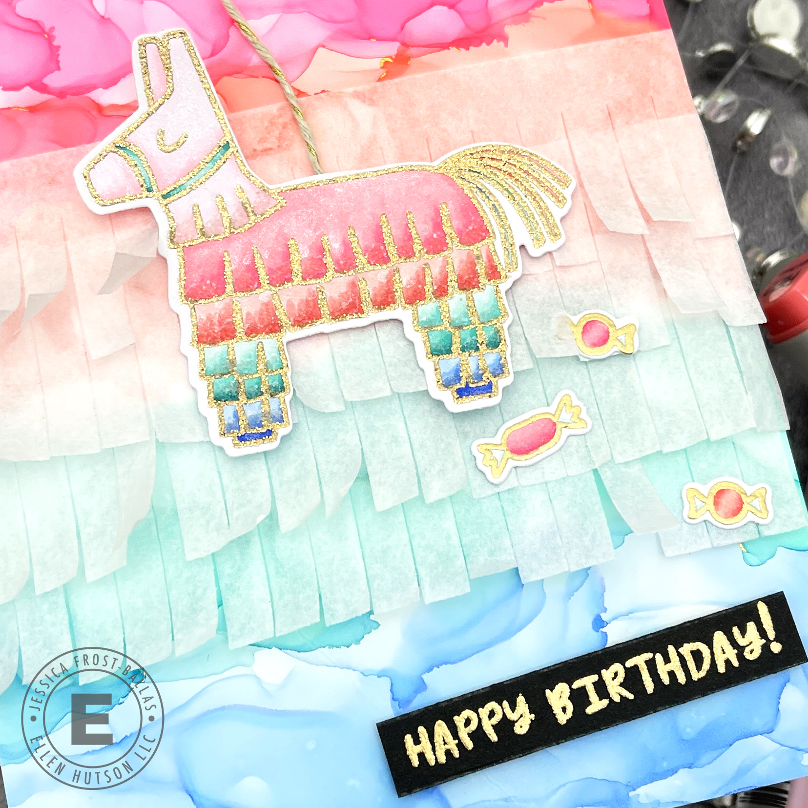 Then I stamped the pinata and candy from Hit That in versamark and heat-embossed them with gold sparkle embossing powder. I colored them with copic markers and then die-cut them with the coordinating dies. Then I die-cut the middle-sized Neverending Fringe from white tissue paper and layered it onto the panel. I used a little glue to adhere the candy and then added the pinata to a piece of gold sparkle twine. I covered the pinata with spectrum noir clear sparkle and then added a little rock candy glitter around the edges of his fringe. The extra weight of the glitter helps him swing back and forth across the panel when you tilt the card! Finally I added a sentiment from Hit That!