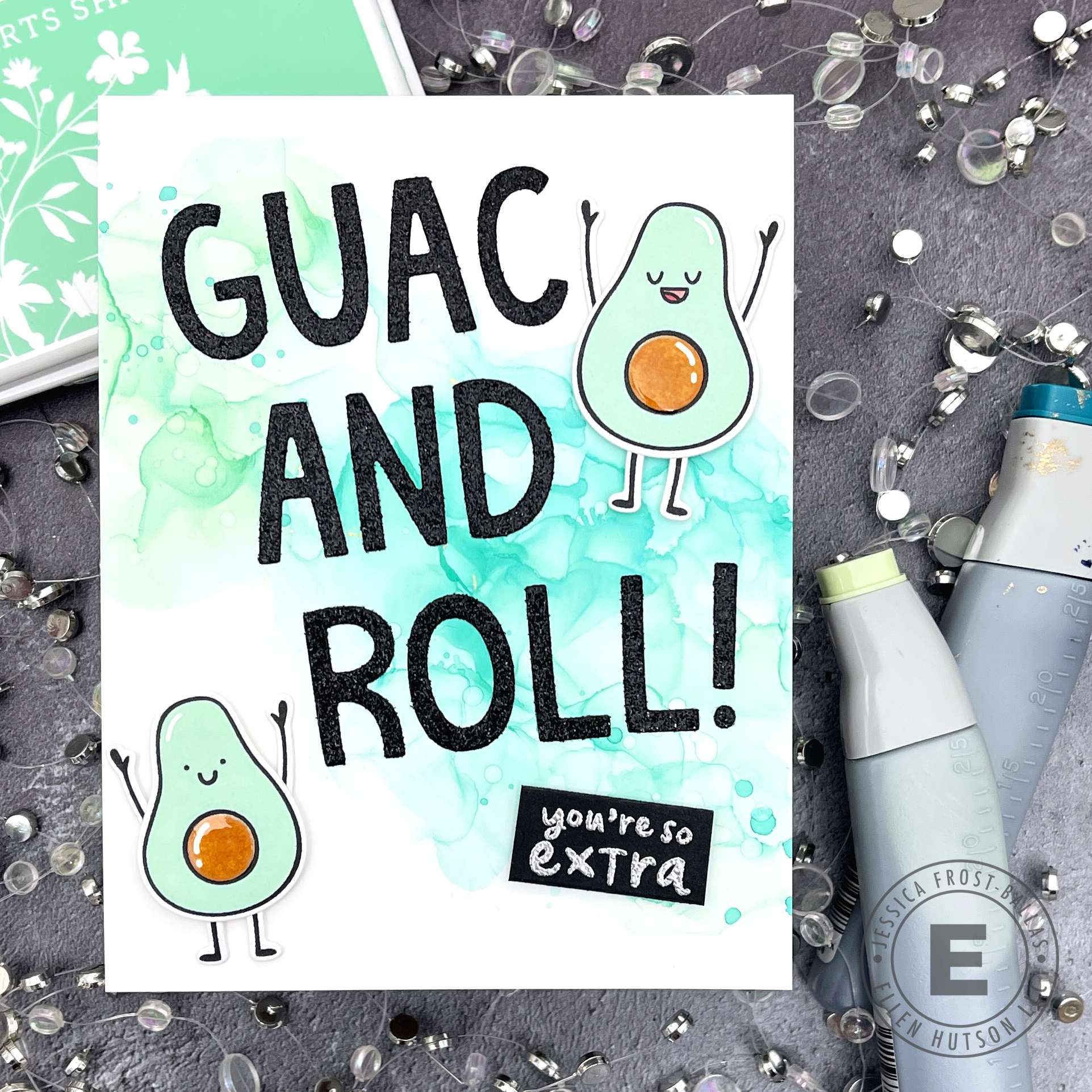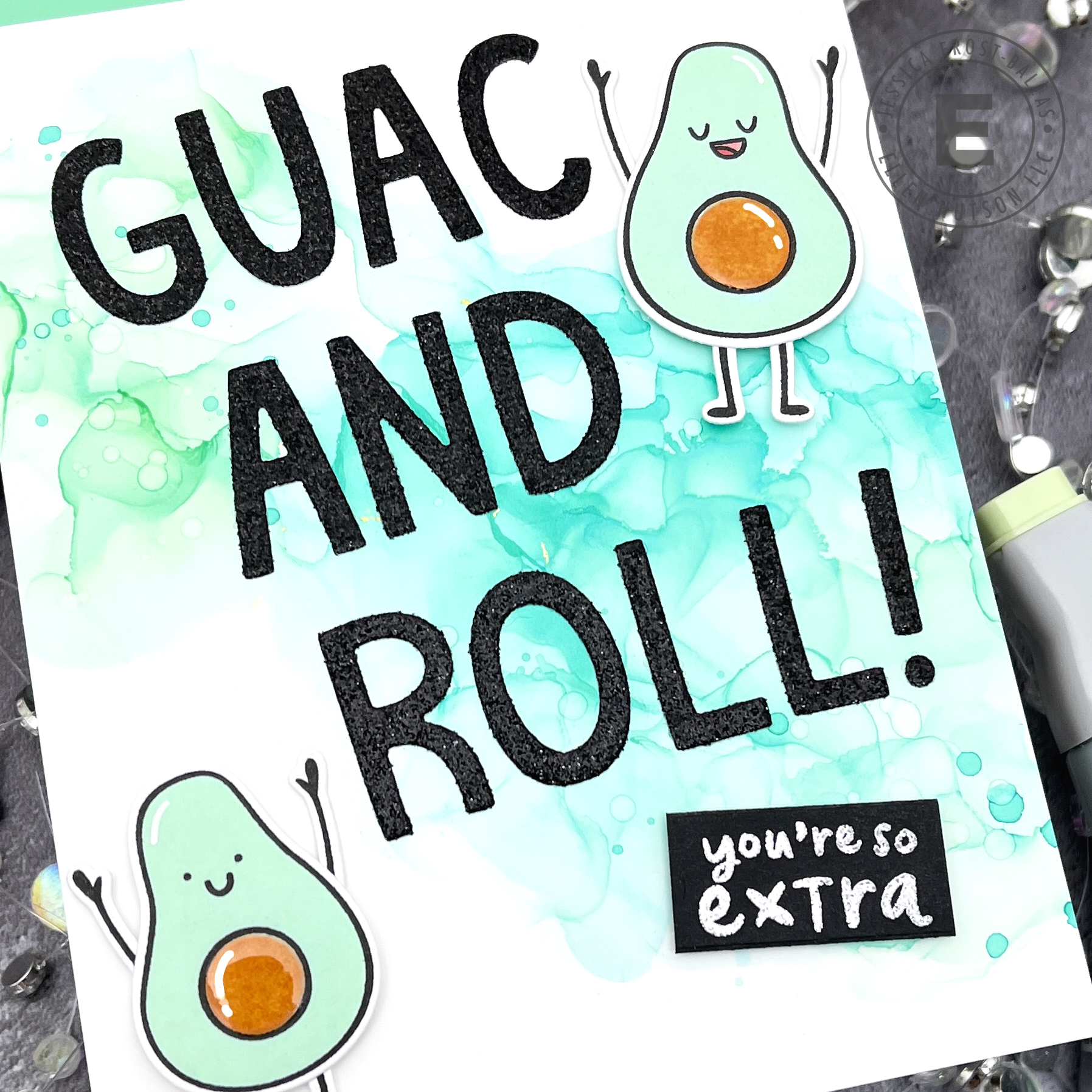 While the panel was drying I stamped my avocados from Guac On and die-cut them with the coordinating dies. I used an alphabet die set from Lawn Fawn to create my custom sentiment and adhered it to the panel. Then I added my avocados and a smaller sentiment stamped from Guac On. Finally I finished the card with a little nuvo crystal glaze on the avocado centers!