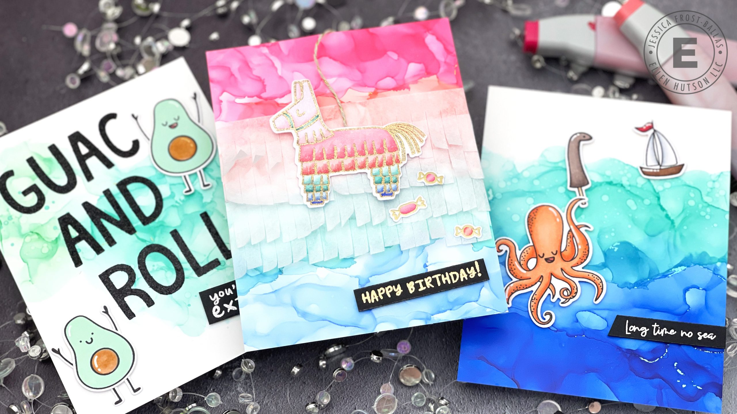 My next trio of cards shares how you can use alcohol inks in different ways to create backgrounds and scenes for cards!