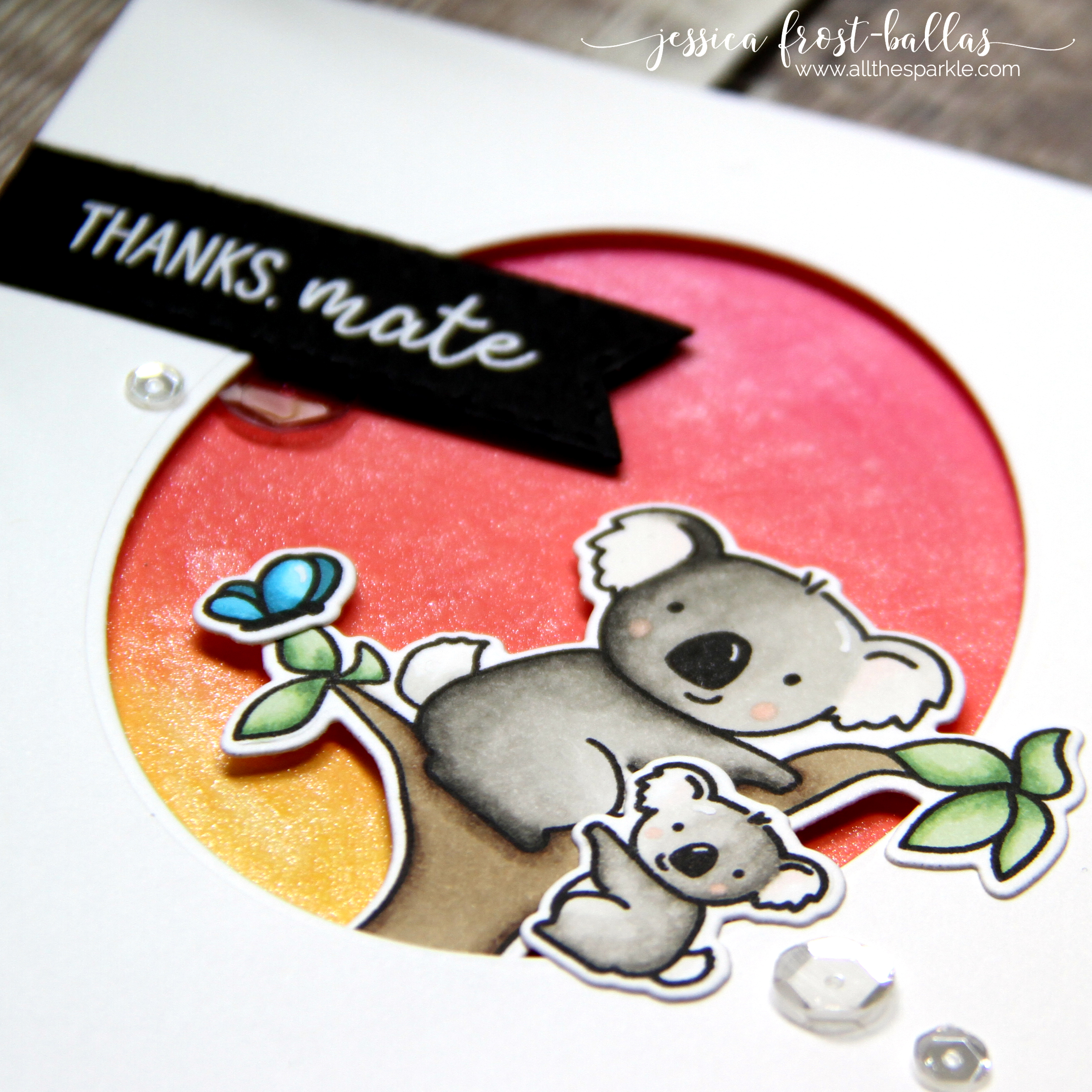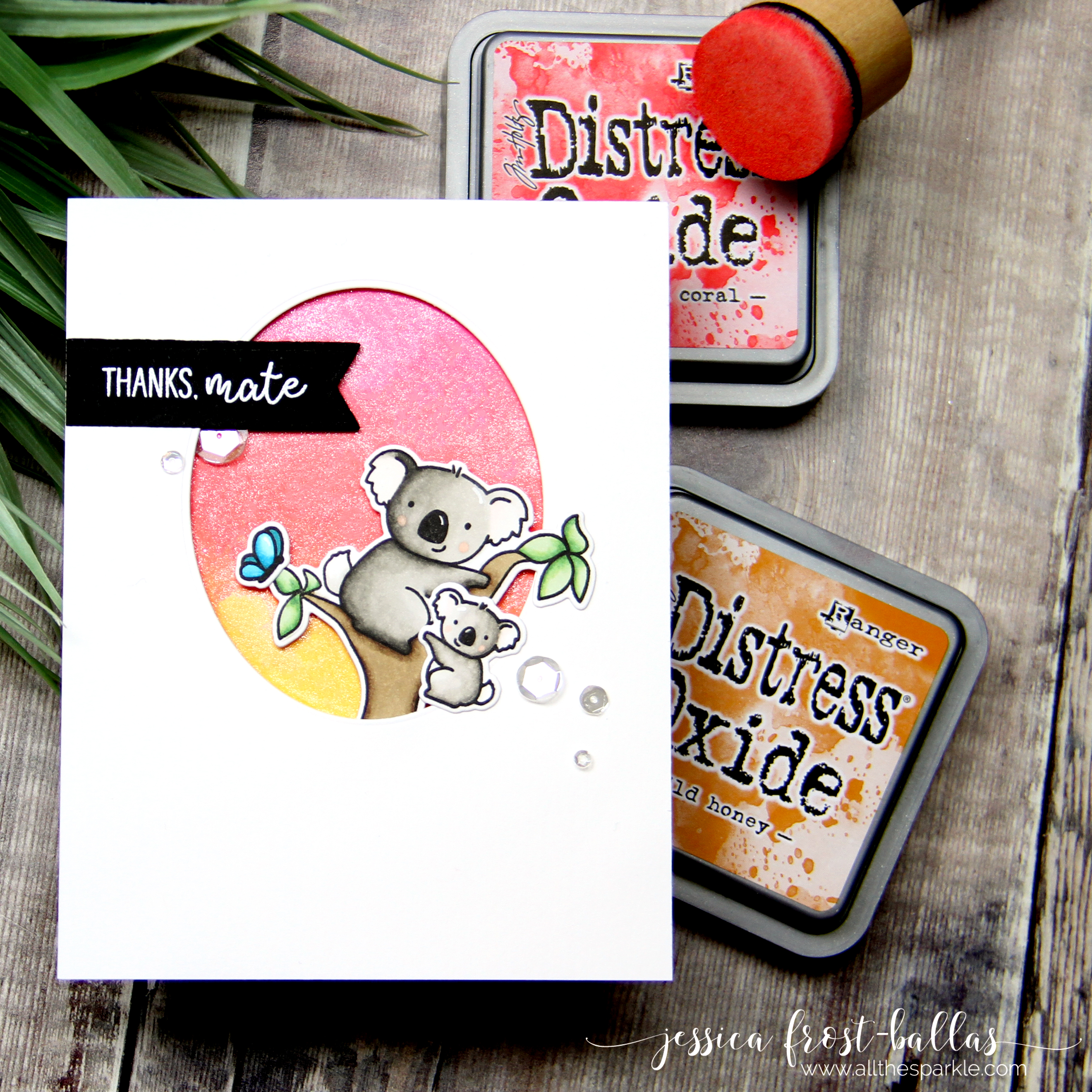 I started by blending wild honey, abandoned coral, and picked raspberry distress oxides onto white cardstock and then sprayed it liberally with shimmer spray. I let it dry while I worked on the rest of the card. I used the nesting ovals infinity dies from Hero Arts to cut an oval panel from a piece of white cardstock to create a frame for my koalas! I also stamped the sentiment from G’Day Mate onto black cardstock and heat-embossed it with white embossing powder. I die-cut it with the stitched fishtail dies to create a fishtail banner.