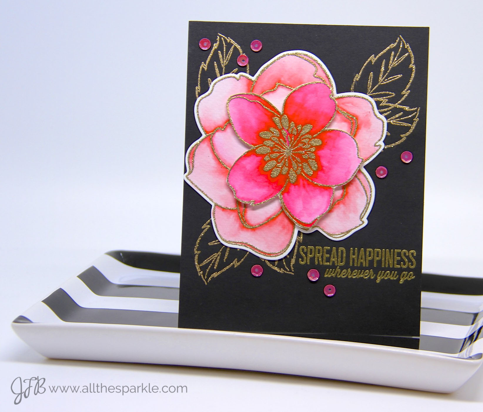 Then I stamped the leaf from Mama Elephant’s Freestyle Florals onto black cardstock and embossed it with the same gold tinsel embossing powder. I also stamped the sentiment from Mama Elephant’s Up and Away and embossed it with super fine gold embossing powder. I layered the magnolia onto the black cardstock with foam mounting tape and added a sprinkling of pink sequins to finish the card!