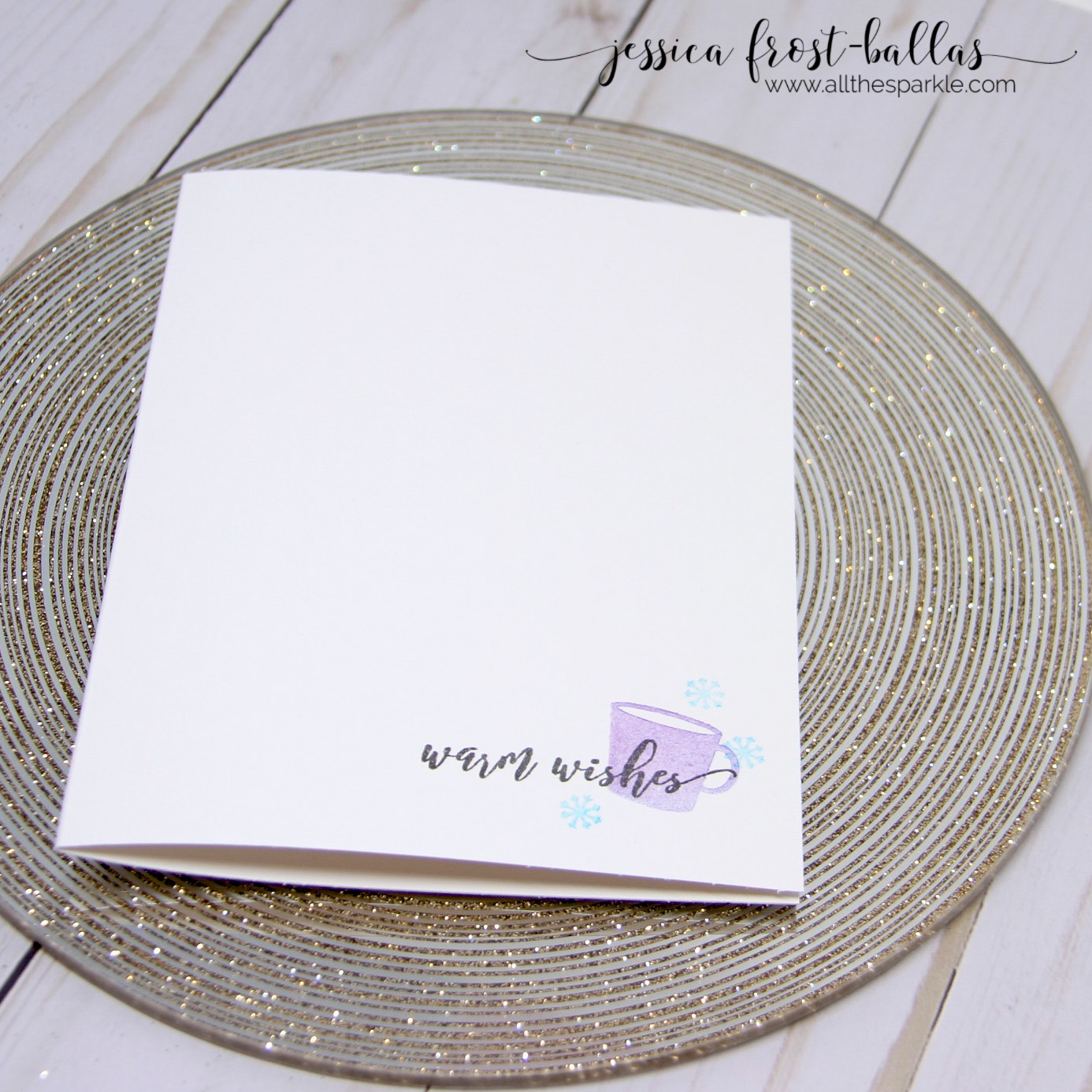 My second card is super CAS! I used generation stamping again to get that pale shade of blue and mixed inks to get that pretty shade of purple. Another fun aspect of these inks is that they don’t seem to transfer ink onto the pad (seriously, it’s like magic!) so I inked the mug with red ink, then with blue, stamped it once on scrap paper, and then stamped it a second time on my card for that soft shade of purple. I added a few icy blue snowflakes and the sentiment to finish the card!