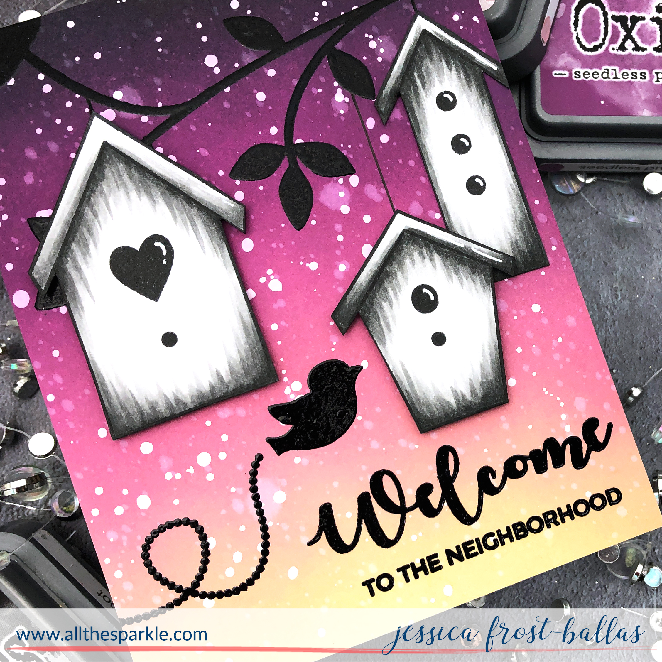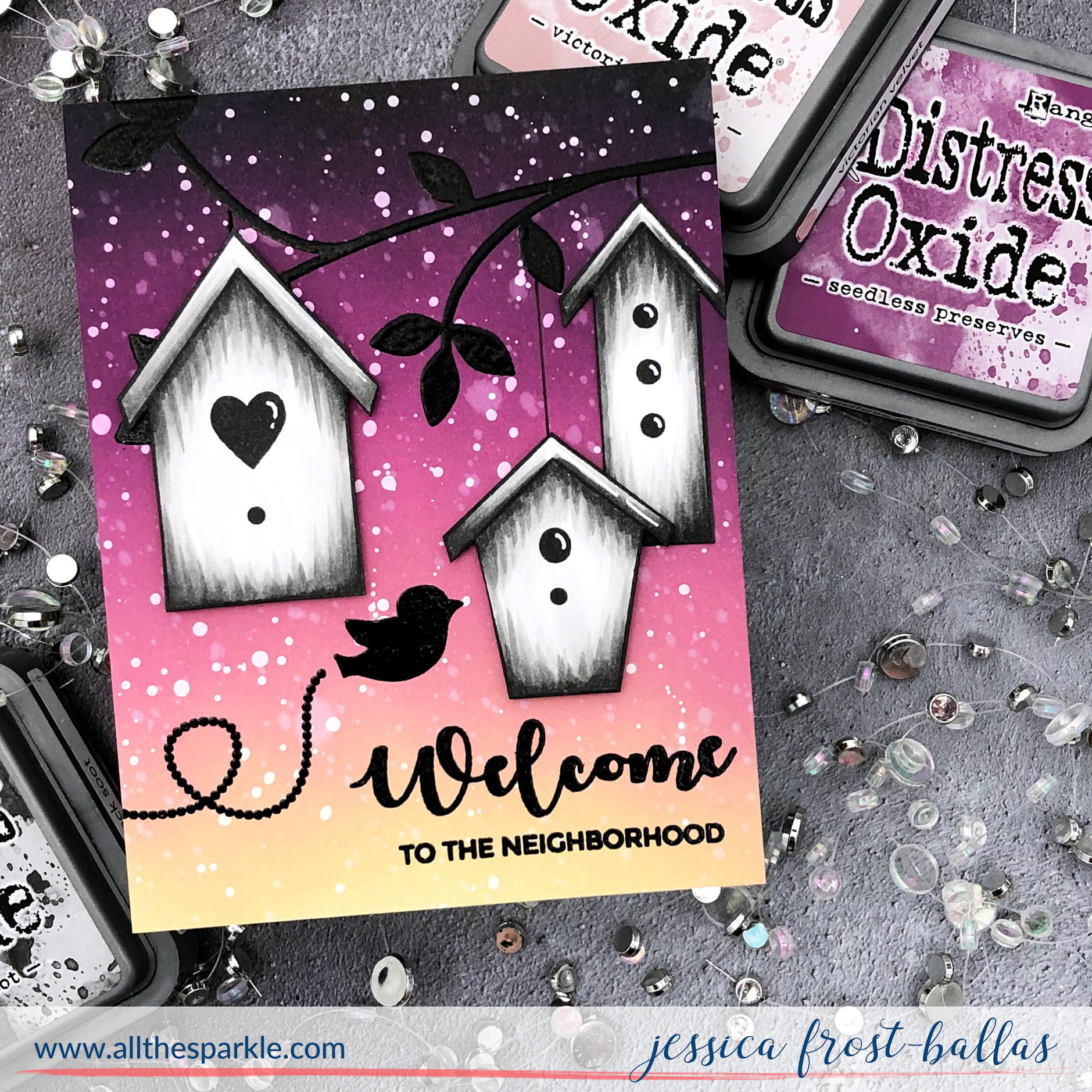 I decided to create a sunset scene for my cute little birdhouses and blended antique linen, victorian velvet, seedless preserves, and black soot distress oxide ink onto a panel of strathmore bristol cardstock. Once the panel was dry I spritzed it with water and splattered it with white gouache to create stars in the sky.