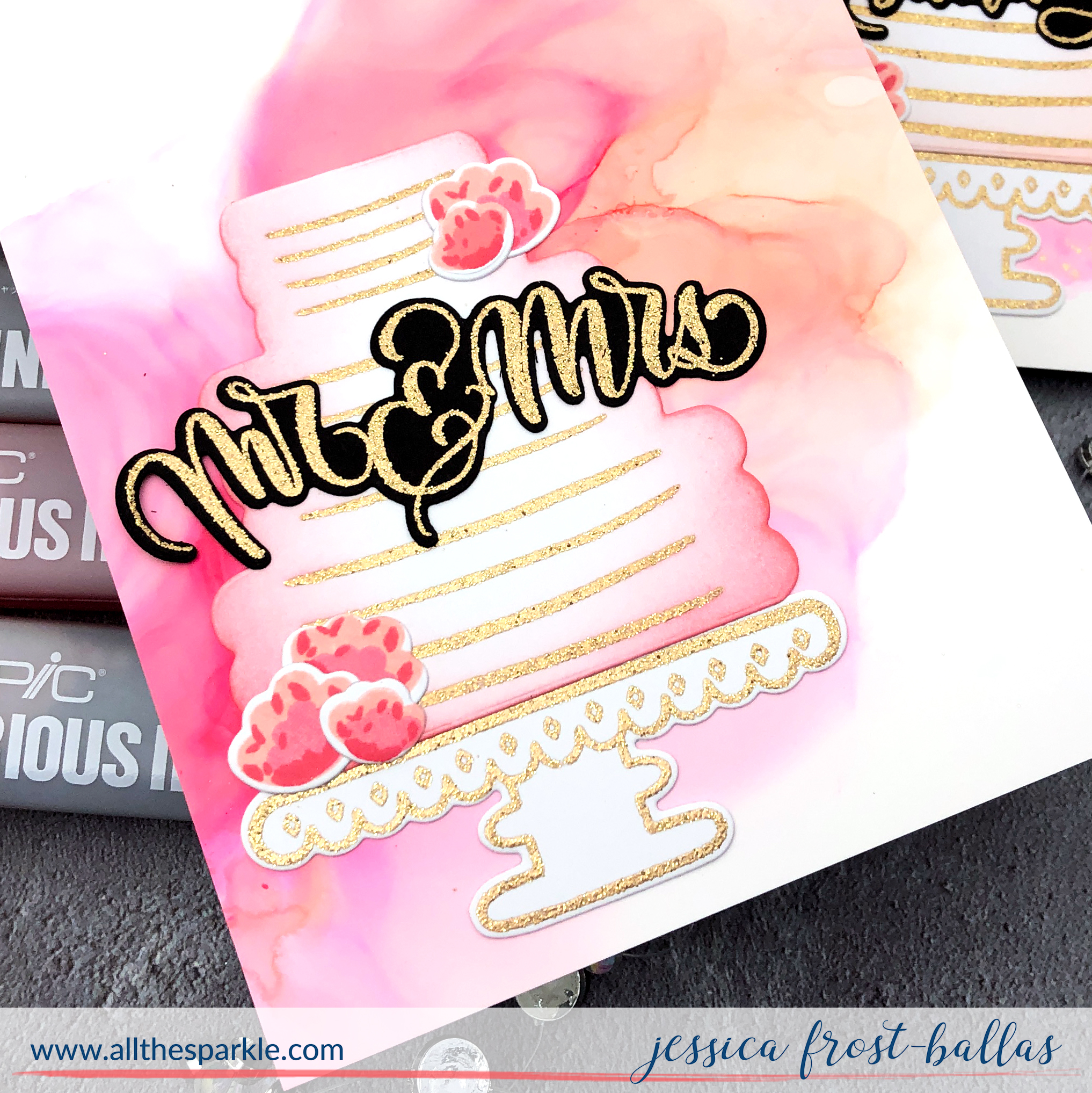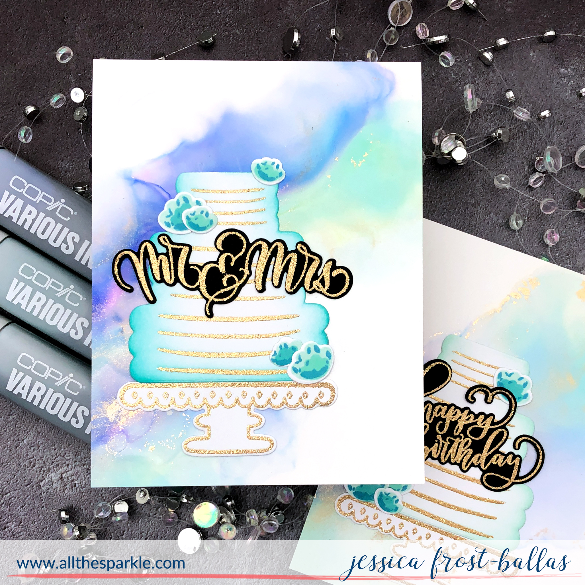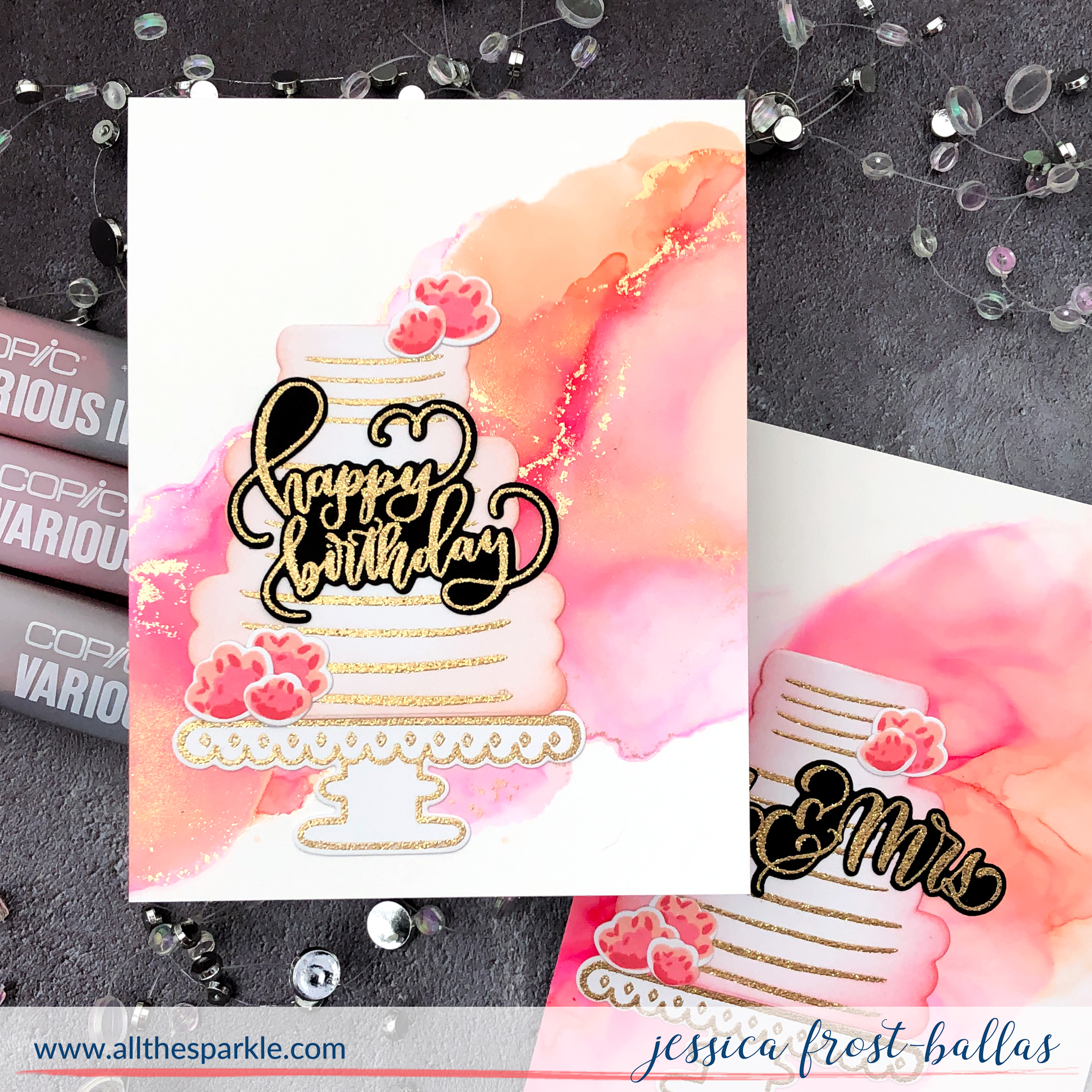 Good morning! Today I’m sharing a video pairing alcohol ink backgrounds with beautiful stamped cakes from Gina K Designs to create a quartet of cards perfect for birthdays, weddings, or anniversaries!