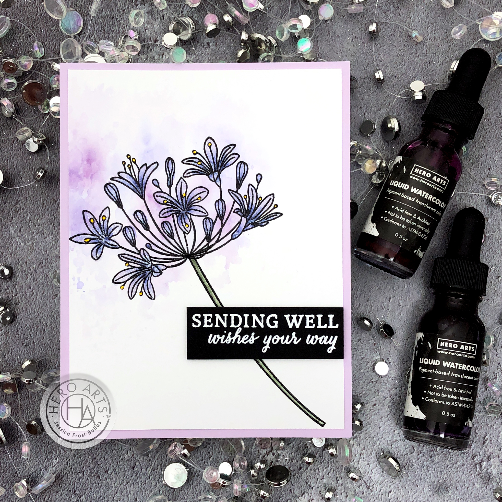 My last card features the gorgeous Beautiful Day Agapanthus with liquid watercolors! I stamped it onto watercolor paper with versafine and heat-embossed it with clear embossing powder. I dropped a little mulled wine and purple liquid watercolors onto a scrap sheet of acetate, spritzed them with water, and then smooshed the acetate over my embossed flower to add a little color to the panel. Then I lightly painted the agapanthus with purple and mulled wine liquid watercolors. I also added a little dandelion liquid watercolor to the stamens and moss to the stem. Next I stamped the sentiment from the Beautiful Day Agapanthus set with versamark on Pitch Black cardstock and heat-embossed it with white embossing powder. I trimmed that down and adhered it to the card with foam mounting tape. Finally I adhered the watercolor panel to an A2 panel of Lavender cardstock and adhered that to a top-folding Dove White card base!