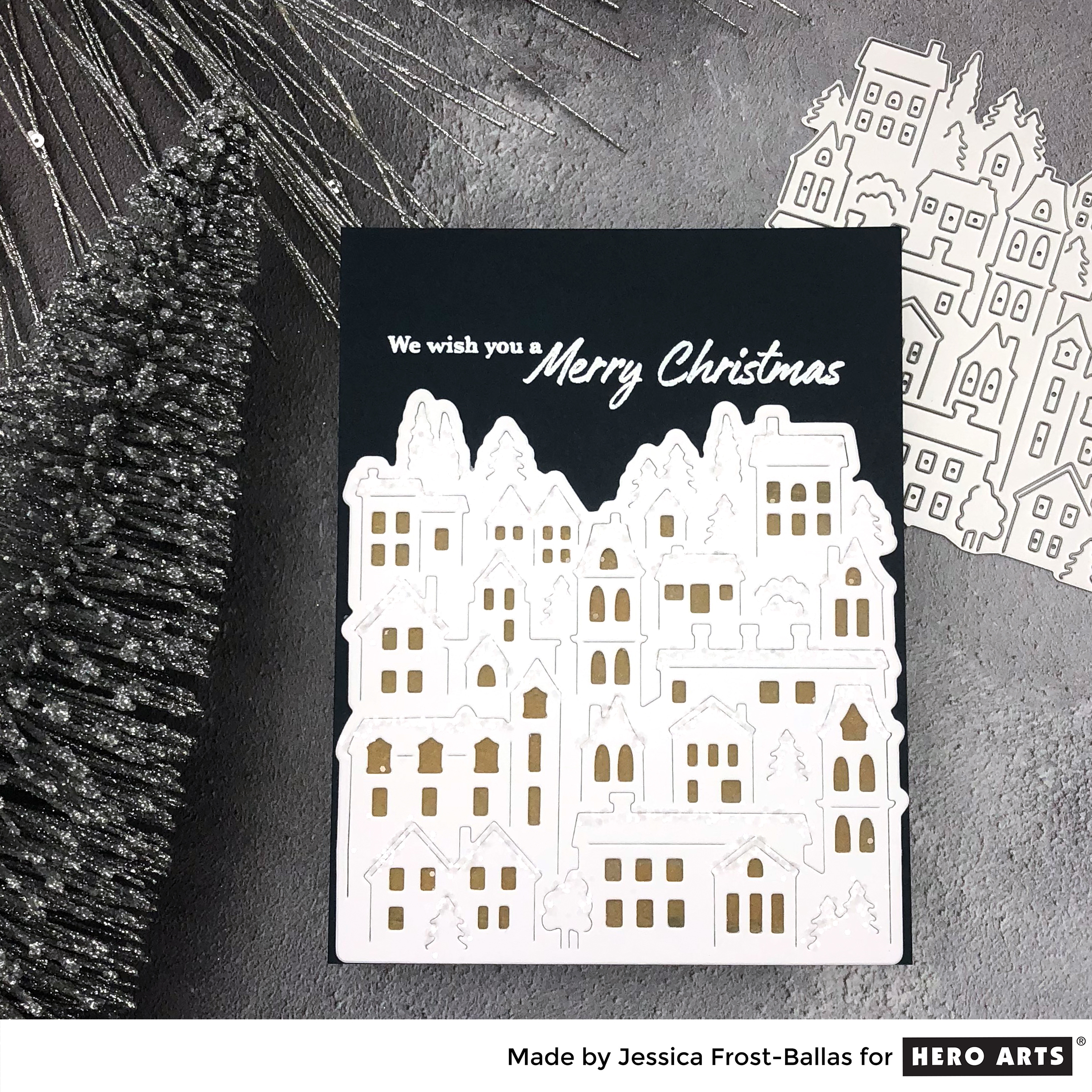 My second card uses the fun Paper Layering Neighborhood die to create a card with very little stamping! 😉 I started by die-cutting the paper layering die with white cardstock. Then I took a piece of vellum, laid it over the back of the die, and traced inside the outline of the die. I trimmed off the excess and then adhered it behind the die. Then I used a copic marker to color each of the windows. I let that dry for a bit so the ink wouldn’t smear on the vellum. While that was drying I stamped the sentiment onto dark navy cardstock and heat-embossed it with white embossing powder. Once the vellum was dry I adhered my neighborhood to the navy card panel. Finally I added a little glue and snowfall glitter to the tops of each house and tree to create a snowy wonderland!