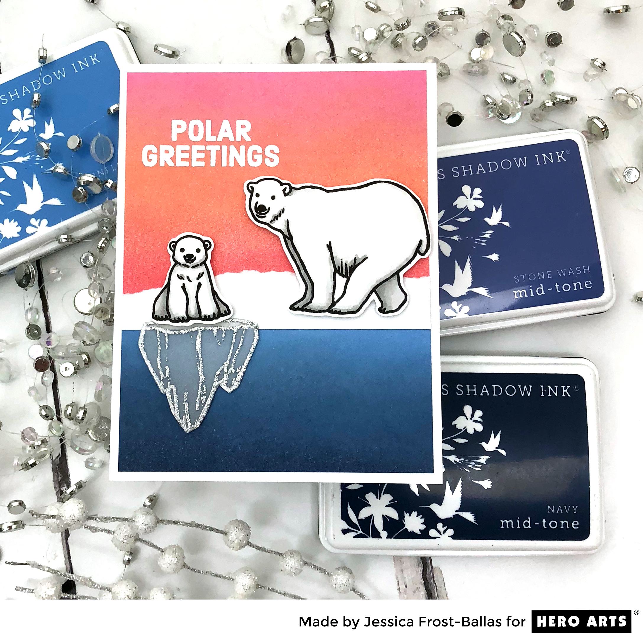First up is this adorable polar bear duo! I’ve had a thing for polar bears since I was a young kid…most kids collect brown teddy bears, I only wanted polar bears (which weren’t always easy for my parents to find!). So when I saw this set I was SO ridiculously excited! To start I stamped the polar bears from Polar Greetings on white cardstock with versafine and heat-embossed them with clear embossing powder. I added a little shading with copic markers and then die-cut them with the coordinating dies! I also stamped the iceberg on vellum and heat-embossed it with silver glitter embossing powder. To create my background I blended bubble gum, dark quartz, pale tomato, cornflower, stone wash, and navy ink on a piece of strathmore bristol cardstock. I used post-it tape to mask the top and bottom while I blended to create the sky and water. Then I took a piece of white cardstock, ripped it to create a rough “snowy” ice cap and adhered it over the background to cover the line of ink blending. Finally I stamped the sentiment with versamark and heat-embossed it with white embossing powder!