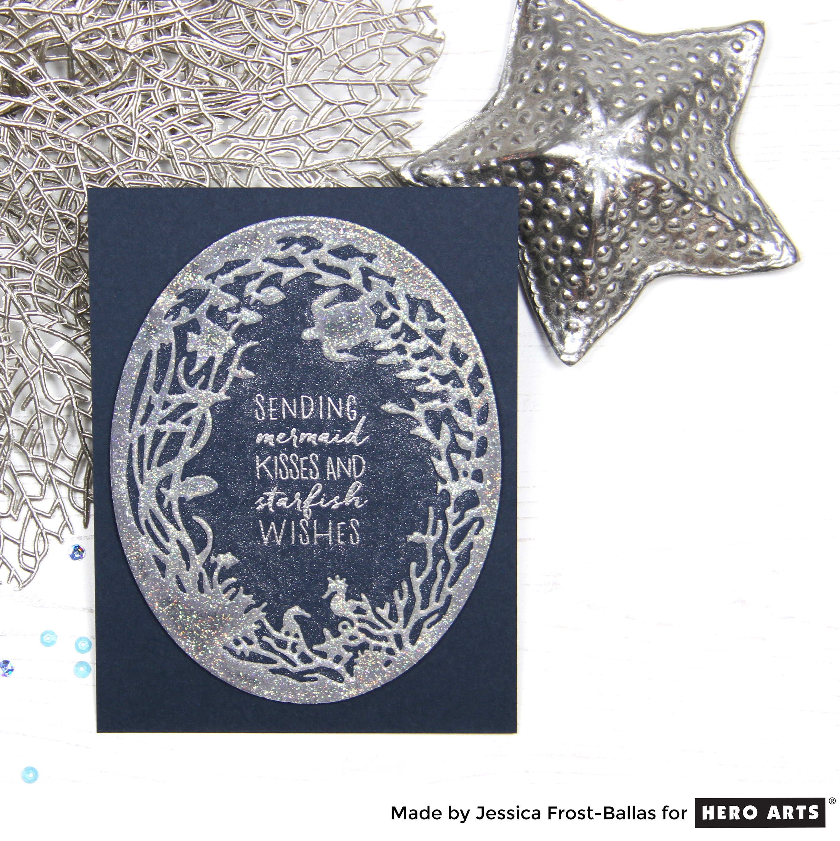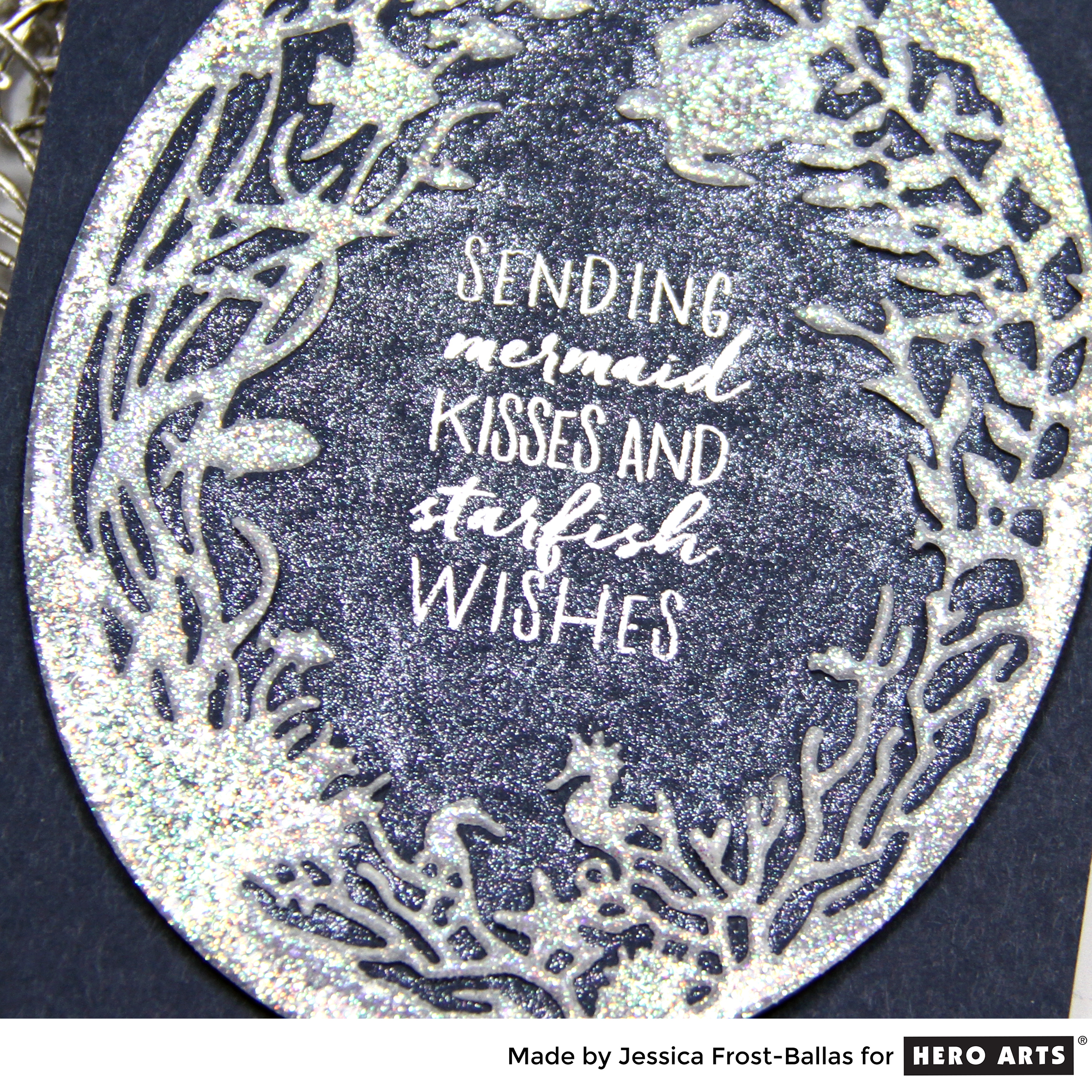 This one is a lot more CAS but FULL of sparkle and shine! I started by adhering stick-it adhesive to the back of a sheet of vellum. Then I painted the vellum with iridescent medium and allowed it to dry completely before die-cutting the Reef Border add-on die. I wanted the die to have a little more sturdiness so I pressed my versamark pad over the die and heat-embossed it with sparkle embossing powder for a little extra sparkle. Then I stamped the sentiment from the kit onto the middle of a piece of dark blue cardstock and heat-embossed it with silver embossing powder. I removed the backing from the adhesive and adhered the vellum border to the card panel. Finally I took a spectrum noir clear sparkle brush and colored the inside of the blue cardstock. Simple but super sparkly! 😉